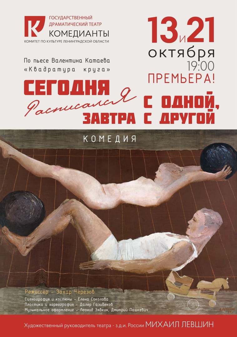 13 и 21 октября театр «Комедианты» представляет премьеру спектакля «Сегодня расписался с одной, завтра с другой» по пьесе Валентина Катаева «Квадратура круга».
