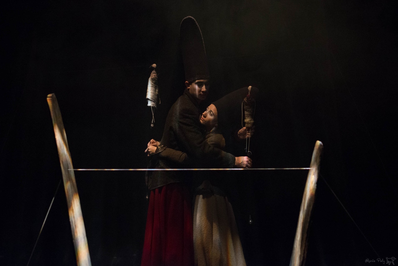 Подумать только — пара досок, веревка, натянутая между ними, камни, игра света и тьмы — и мы уже в крохотном ауле, затерянном где-то в горах Кавказа (а тема самоизоляции нам сейчас ох как близка!). Здесь принят жестокий обычай — девушка перед замужеством должна пройти к жениху над пропастью по канату. Дойдет — сыграют свадьбу, сорвётся — похороны. Не по прихоти односельчан действует такой закон — а потому что десятилетия назад во время страшного пожара спаслись лишь те жители, кто смог перебежать по верёвке на другую сторону ущелья. Так и поддерживается традиция… и уже радостно потирает руки Смерть, готовящаяся получить новую жертву: «Раз невеста, два невеста, на веревке мало места». Безучастно наблюдает за происходящим Метеоролог (Бог?), доверяющий решение проблем людям. Лишь юный Орёл, залетевший в эти края, не может принять бессмысленную жестокость. Именно благодаря его горячности и смелости старый мудрый Филин, уже давно смирившийся с безжалостностью людей, подскажет юноше, как спасти любимую.