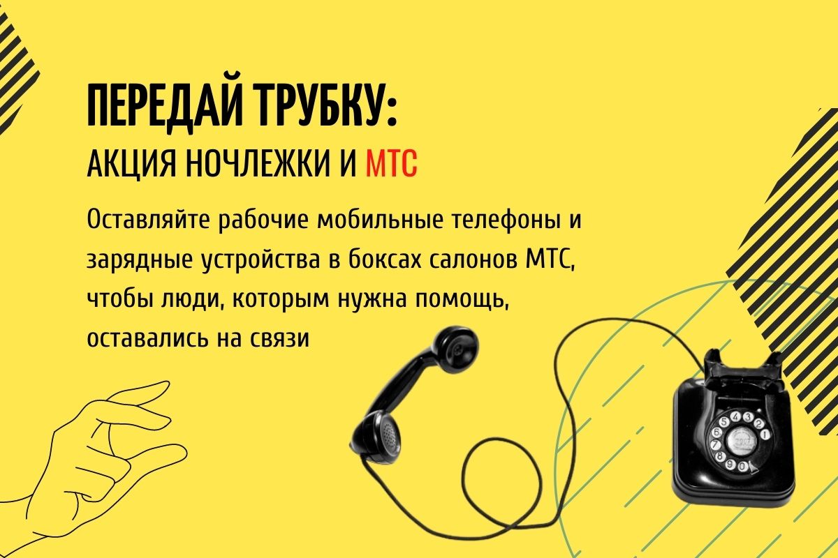 Компания МТС и благотворительная организация Ночлежка проводят совместную акцию: «Передай трубку». В 20 салонах МТС в разных районах Петербурга установлены специальные боксы, в которых любой человек может оставить старый, но работающий телефон и зарядное устройство к нему. Подойдут любые модели: кнопочные и простые смартфоны. Каждый месяц волонтеры Ночлежки будут забирать пожертвованные устройства и передавать в нашу Консультационную службу.
