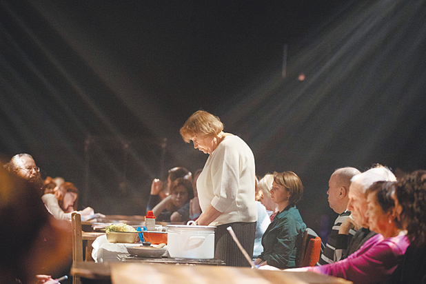 Интересные совпадения бывают, когда ты больна неизлечимо и часто (очень часто) ходишь в театр. На спектакле «Донецк. Вторая площадка» готовят украинский борщ и предлагают в финале попробовать. На спектакле «Фаина. Эшелон» Школы современной пьесы Елена Санаева варила постный борщ, и это, наверное, было самое притягательное блюдо среди любителей театра 26 октября. Угощение щедро приправлено пронзительным, честным и страшным рассказом о войне.