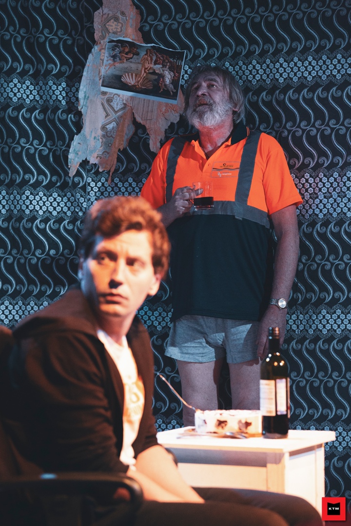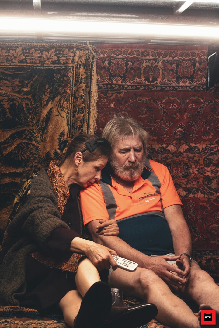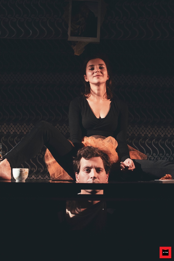 Вот Лиза тоже «на дне». Она не стремится к самореализации, ей нравится выпивать, мыть полы в детском саду и она готова всю жизнь провести в одной комнате с Тошиком (Андрей Жилин), любуясь его затылком. «Не душа — тончайшее кружево» — говорит она про Тошика, объясняя его молчаливость. Весь зал, к слову, окутан кружевными занавесками — на полу, на стенах. Но их постепенно вымещают ковры — комната, в которой поселились молодые, сплошь увешана громоздкими старыми коврами. Так и слабый Тошик задыхается в объятиях Лизы, словно в этих затхлых коврах, и стремится вырваться из-под её гиперопеки на волю и начать новую жизнь. А Лиза..будет и дальше ждать его в своём ограниченном мирке — словно бомбоубежище, готовое принять и спасти в случае катастрофы.