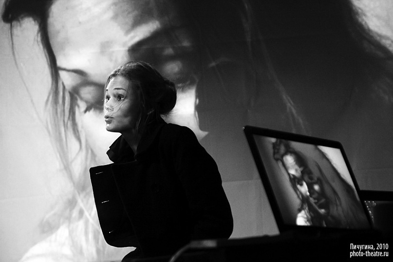 Попробуем передать, проявить невидимое, что происходило на площадке в Доме Шаляпина. Спектакль в плане сценографии очень аскетичный, можно на первый взгляд сказать скудный. Небольшая, холодная комната с голыми стенами, около 20 стульев для зрителя, еще пара — для актрисы, режиссер за столом с ноутбуком и экран во всю сцену как еще один участник постановки. Если режиссер убирает со сцены почти все, кроме текста и актрисы, зачем он это делает?