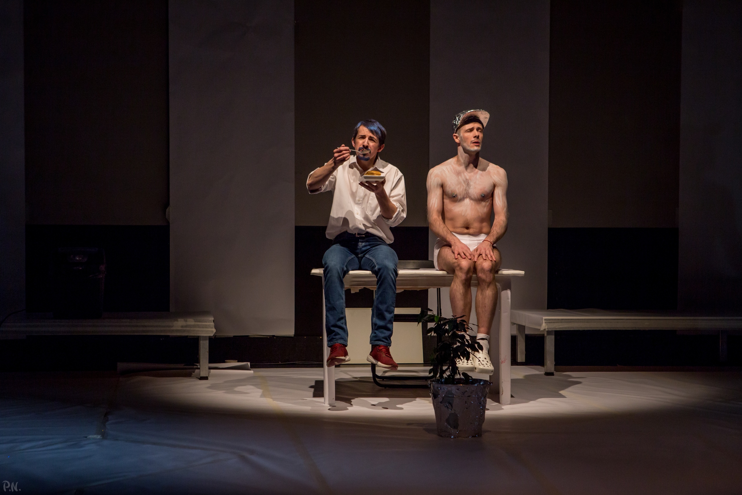 Несколько раз в спектакле происходит «слом четвёртой стены» — когда актёры — именно актёры, а не персонажи — обращаются к зрителям, объясняя свою точку зрения и отношение к политике. Александр Худяков (Гемон) рассуждает о том, что здесь и сейчас, в этой комнате он способен менять обстоятельства, даже влиять на ход действия спектакля. А вот за её пределами? Может ли он осмелиться что-то изменить в стране? А можем ли мы?