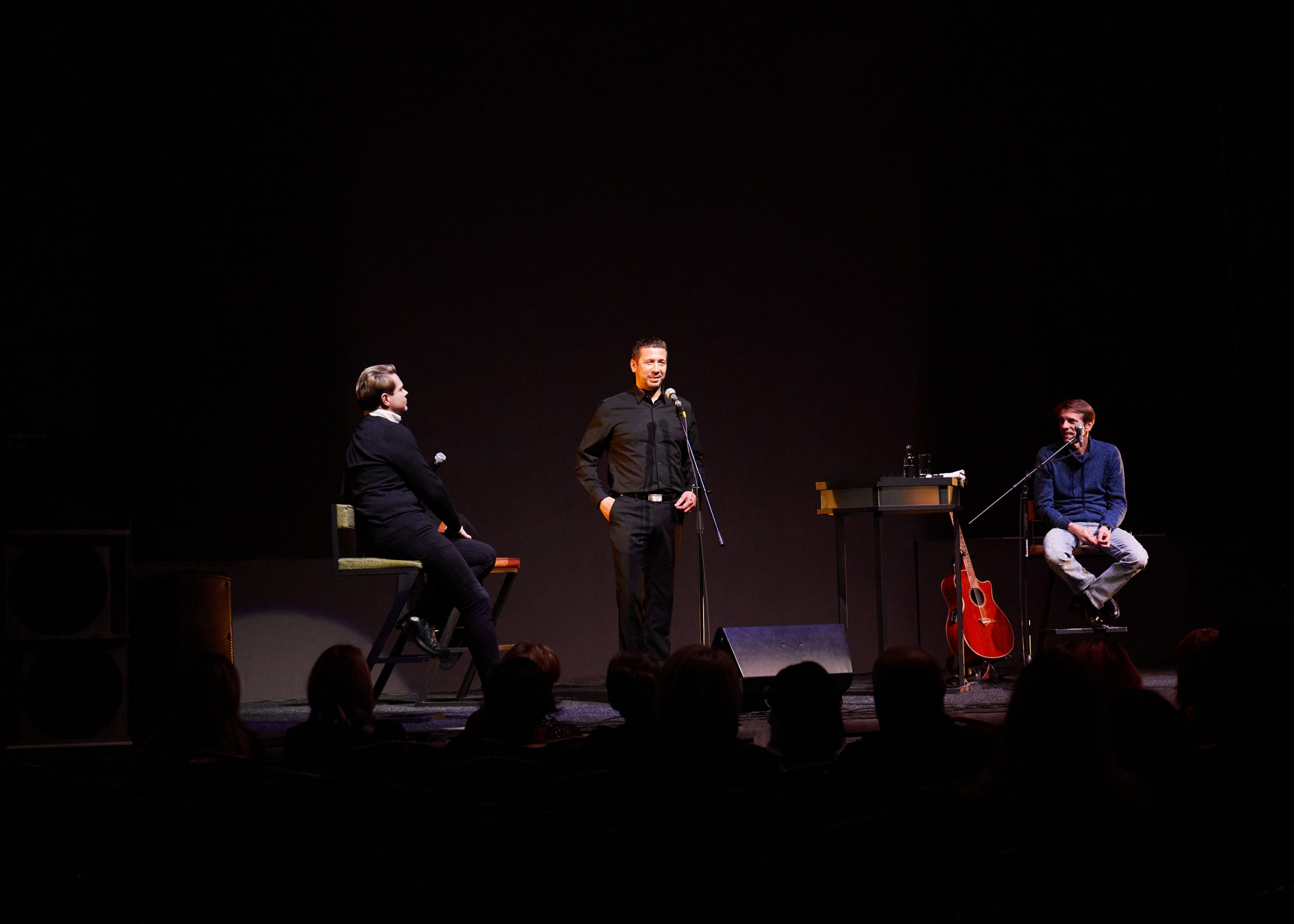 Задуманный “Лендоком” формат импровизации, живого взаимодействия удался на 1000 %. Зрители задавали актерам вопросы. От философских размышлений о жизни после жизни, до любимых постановок, книг и видов спорта: футбола у Алексея Шевченкова и хоккея с мячом у Андрея Мерзликина.