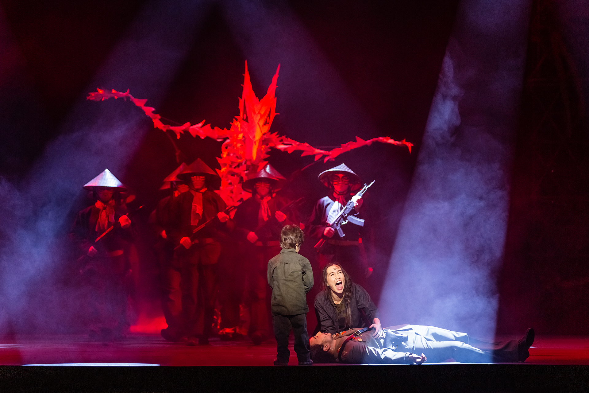 Помимо смещения акцентов, постановщики внесли в спектакль символику. Так, на сцене появляются восточные мифологические персонажи – дракон, олицетворяющий добро, и девятихвостый лис, символизирующий зло. На протяжении всего действия они сражаются друг с другом, также, как воюют друг против друга вьетнамцы и американцы, также, как борются внутри каждого из главных героев доброе и злое начала. Привнесенная в мюзикл символическая часть не просто добавляет глубины происходящему, она заставляет посмотреть на поступки тех или иных персонажей с разных сторон, взвесить, оценить их действия, подумать, а можно ли однозначно назвать белое белым, а черное – черным? Борющиеся лис и дракон делают спектакль более выпуклым, обогащают его саспенсом и хоррором, что однозначно идет ему на руку.