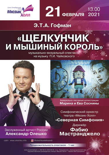 21 февраля 2021 года в 13:00 в сопровождении симфонического оркестра «Северная Симфония» под управлением художественного руководителя театра «Мюзик-Холл» Фабио Мастранджело известный актер, заслуженный артист России Александр Олешко прочтет самую известную сказку Э.Т.А. Гофмана «Щелкунчик и мышиный король» в рамках семейного цикла «Музыка и сказка». Музыкально-визуальный спектакль на музыку П.И.Чайковского будет сопровождаться уникальным акварельно-песчаным шоу от художниц Марины Сосниной и Евы Сосниной с трансляцией процесса рисования на экран.