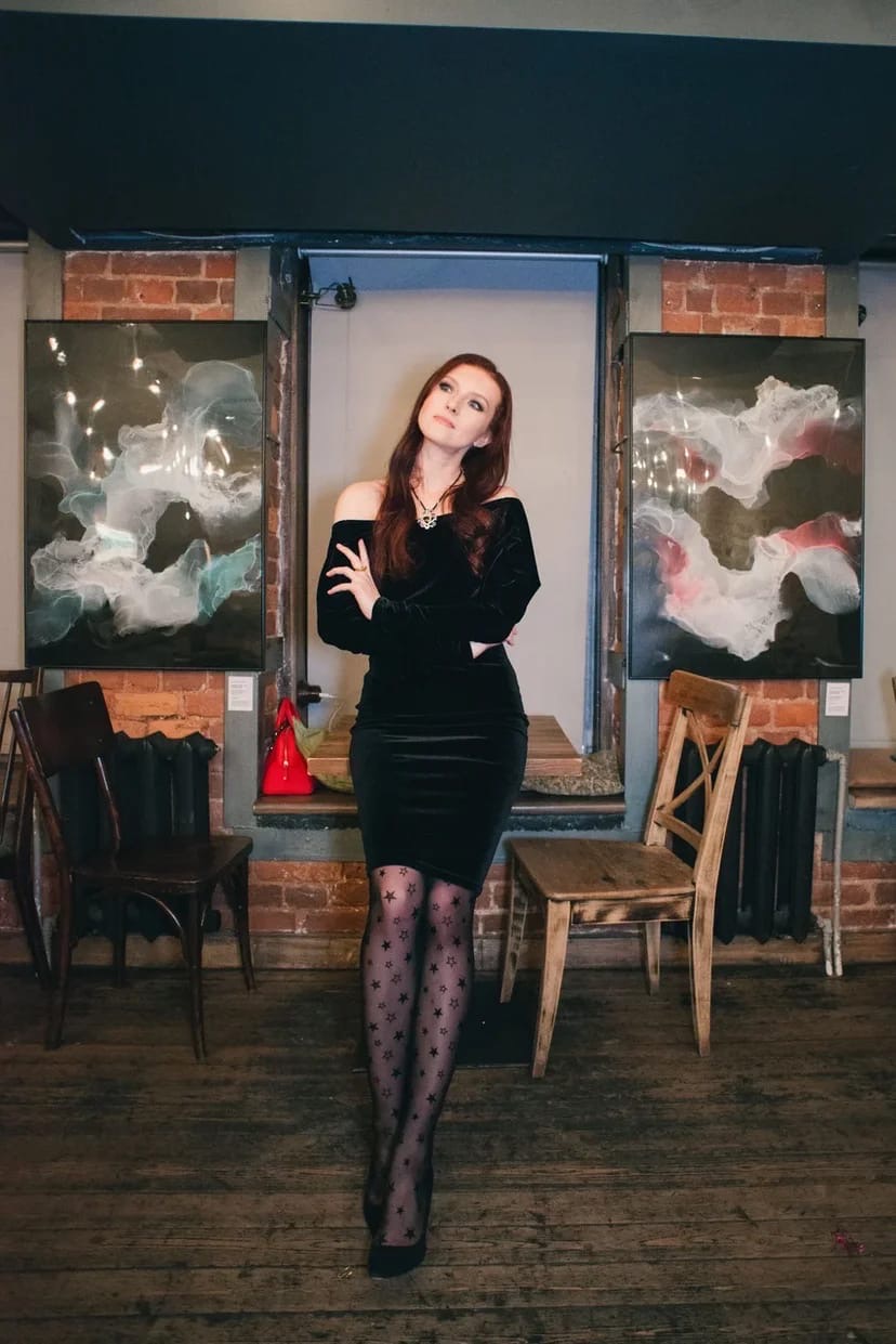 У художницы Надин Сергеенковой эта линия явно пунктирная: она допускает прорывы и невесомости. Именно это ощущение вызывают её полотна, сотканные из звездной пыли. Благодаря новой технике спиртовых чернил Надин добивается специфического эффекта – продолжительного звучания немых звёзд, зависших в угольной черноте вселенной; неудержимого распускания магического цветка, вырастающего из звёздного потока; леденящего ощущения космического ветра, прорвавшего земную атмосферу; и слепящего диска затмения…