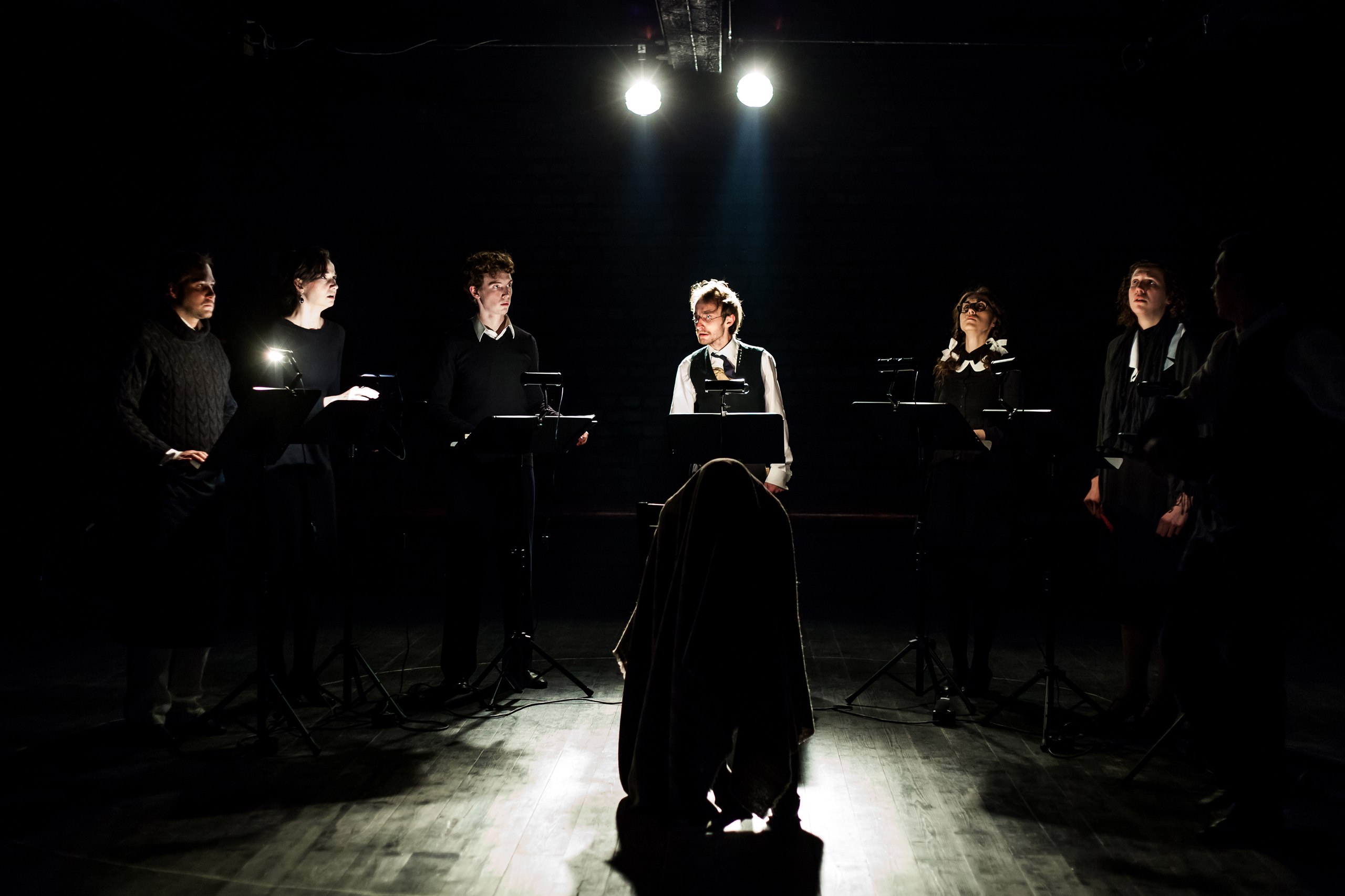 Наблюдает за жизнью обитателей убежища загадочный человек в углу сцены. Бесстрастным голосом, как сама Судьба, он зачитывает документальные хроники тех лет. Из его уст мы узнаем, что случилось с Анной и её семьей, как поступали с младенцами в концлагерях и почему в газовых камерах задохнувшиеся люди не падали. Рядом с ним — шкаф, напоминающий каталог с заведенными делами на неугодных людей, периодически он его открывает, но оттуда сыпется лишь песок (прах? пепел?), а порой вырываются страшные языки пламени.