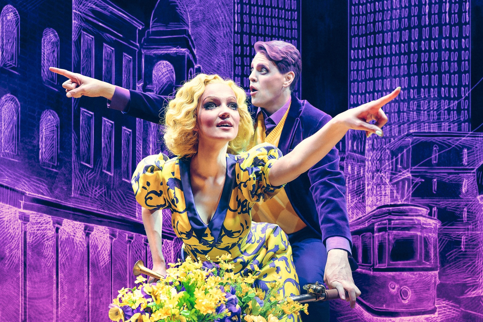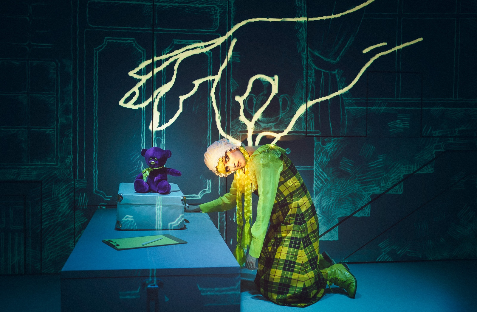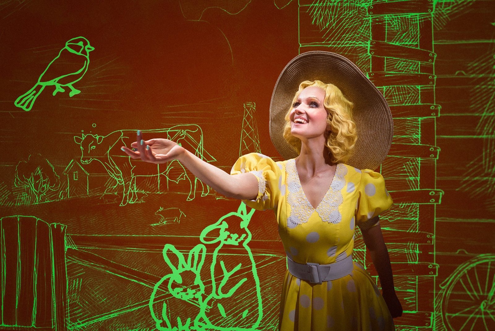 Кстати, для Алексея Франдетти это не первое обращение к роману Daddy Long Legs — в прошлом году, во время пандемии, он создал первый инста-мюзикл «Мой длинноногий деда». Возможно, именно в тот момент у режиссера появилась идея воплотить произведение на сцене, дополнив его ярким визуальным контентом. Художник-постановщик Вячеслав Окунев с помощью креативной студии Artnovi создал волшебный мир героев, напоминающий то ли графику, то ли американский комикс — на сцене расцветают цветы, ёлка загорается огоньками, герои перебрасывают друг другу рисунки и письма (привет, 21 век, эмодзи и стикеры). Художник по свету Глеб Фильштинский дополняет действо яркими световыми партитурами, которые меняются в зависимости от атмосферы, настроения героев, локации.