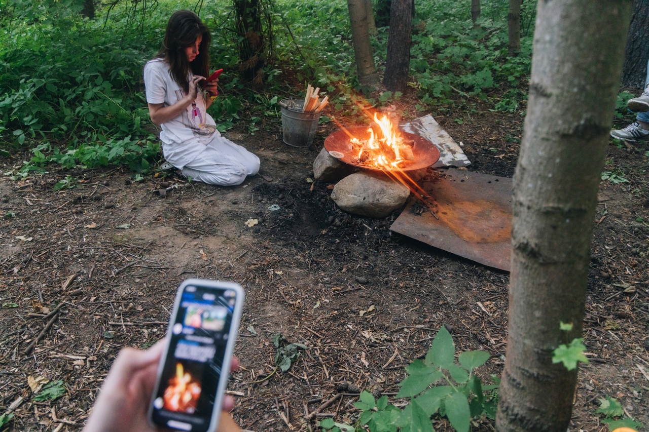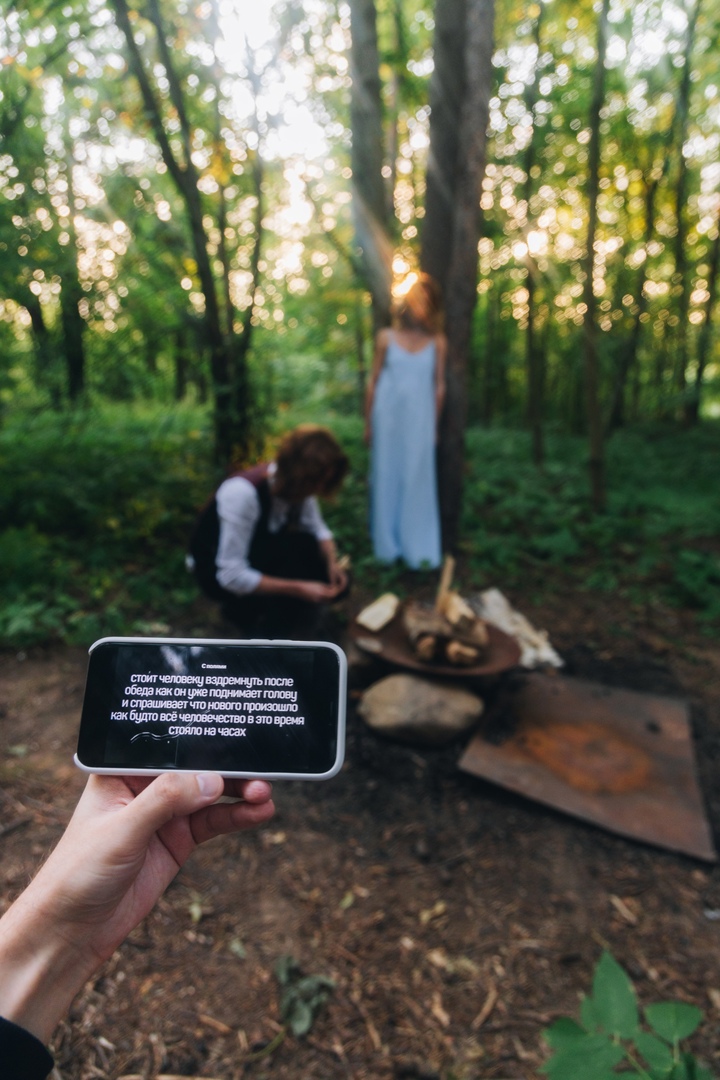 Что происходит со зрителями в усадьбе «Приютино» — описать сложно. Чистый иммерсивный опыт, когда ценность переживаний становится настолько личной, что обсуждать это становится даже немного неприличным. В предметной картинке все до абсурда просто: деревянная сцена, два актера (Алишер Умаров и Анастасия Балуева), лес, костер, барабанные ритмы, на экране телефона — фразы из книги и режиссёрские реплики. Магия создаётся во внутреннем мире зрителя. То самое перформативное мерцание, спектакль, звучащий инсайтами, для каждого свой. В какой-то момент можно просто выпасть и обнаружить, что на несколько минут личное Я растворилось и сознание улетело куда-то за границы культуры и цивилизации, установок и сознательных целей.