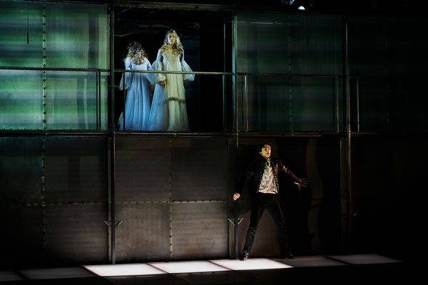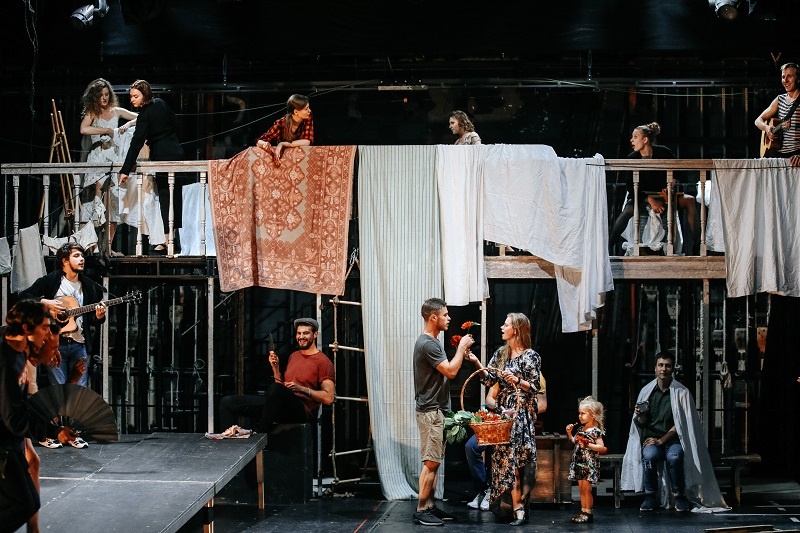 И если в начале постановка напоминает фильм Лукино Висконти, когда под звуки гитары и кошачье мяуканье жители Вероны смеются, развешивают постельное белье, флиртуют, а потом поют от избытка выпитого и глубоких чувств, то второе действие из-за серовато-красного видеоряда и пронзительной глубины актерской игры с фокусом, направленным внутрь себя, стилистически похоже на кинокартины Александра Сокурова.
