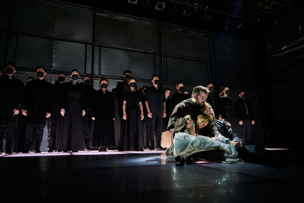 В самом начале спектакля актеры выходят на сцену в черных костюмах под торжественную музыку. На их лицах черные маски, которые мы сегодня видим в магазинах, метро и в театре. Эти маски — не только показатель тяжелого заболевания, с которым весь мир сражается уже не первый год. Они обезличивают, позволяют даже под светом софитов оставаться анонимными и пугающе одинаковыми.