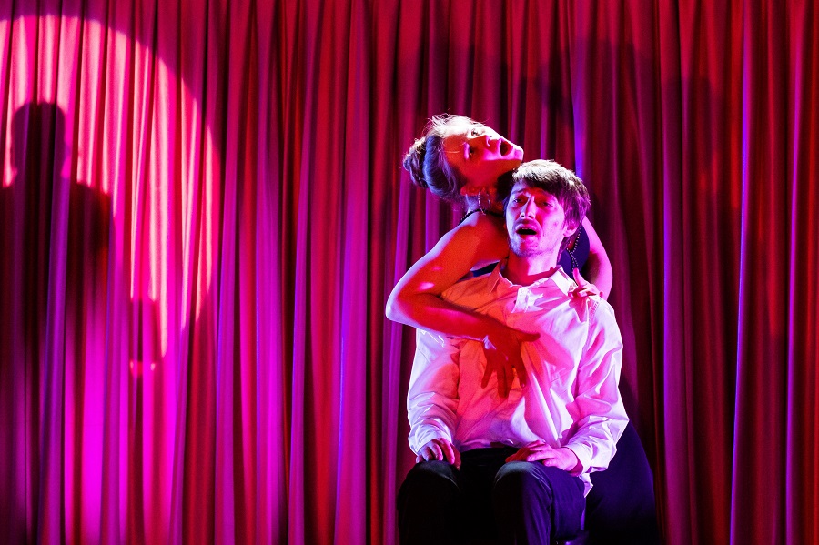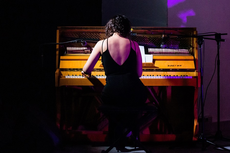Зрителя ждали минималистичные декорации – два стула, трибуна и классический красный театральный занавес. Сбоку – фортепьяно (Алина Ежакова). И музыкальное оформление спектакля от Настасьи Хрущёвой целенаправленно погружало в мир хармсовского абсурда.
