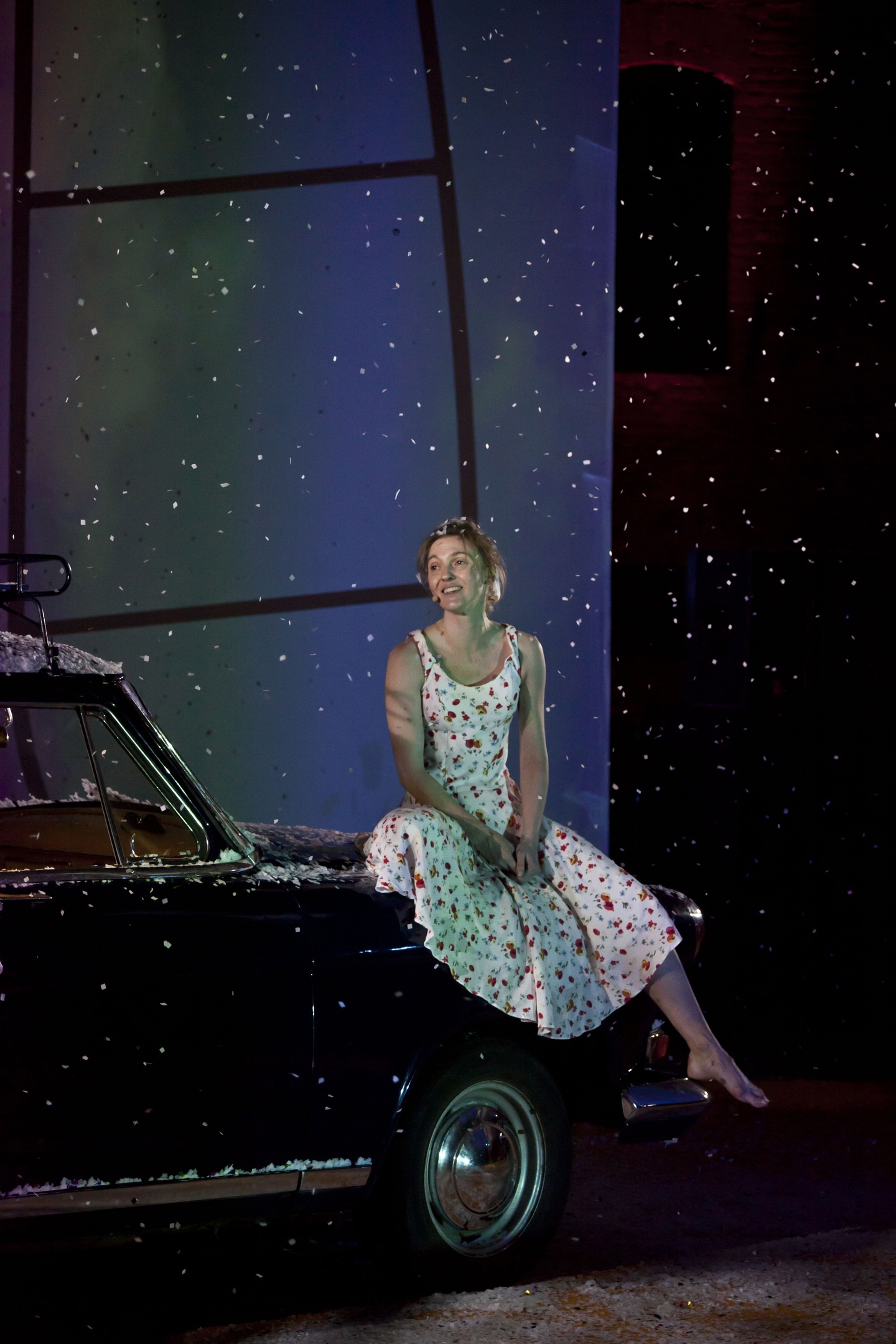 На сцене в машине можно было увидеть молчаливого, неподвижного мужчину. Рядом с ним две девушки совершали непрекращающийся поток действий. Одна – акробатка делала трюки на трапеции в виде ДНК или знака бесконечности, танцевала, вращала зеркала и сияла застывшей на лице улыбкой радости.