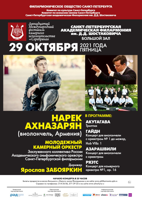 29 октября фестиваль откроется выступлением Молодежного камерного оркестра под управлением Ярослава Забояркина, созданного на базе симфонического оркестра Юрия Темирканова. В программе вечера прозвучат камерные сочинения японского композитора Ясус Акутагавы и эстонца Яана Ряэтса, а также концерт для виолончели с оркестром до мажор Гайдна и концерт для виолончели с оркестром грузинского автора Важи Азарашвили. Интернациональную палитру вечера украсит солист — молодой армянский виолончелист Нарек Ахназарян – золотой медалист ХIV конкурса им. П.И. Чайковского.