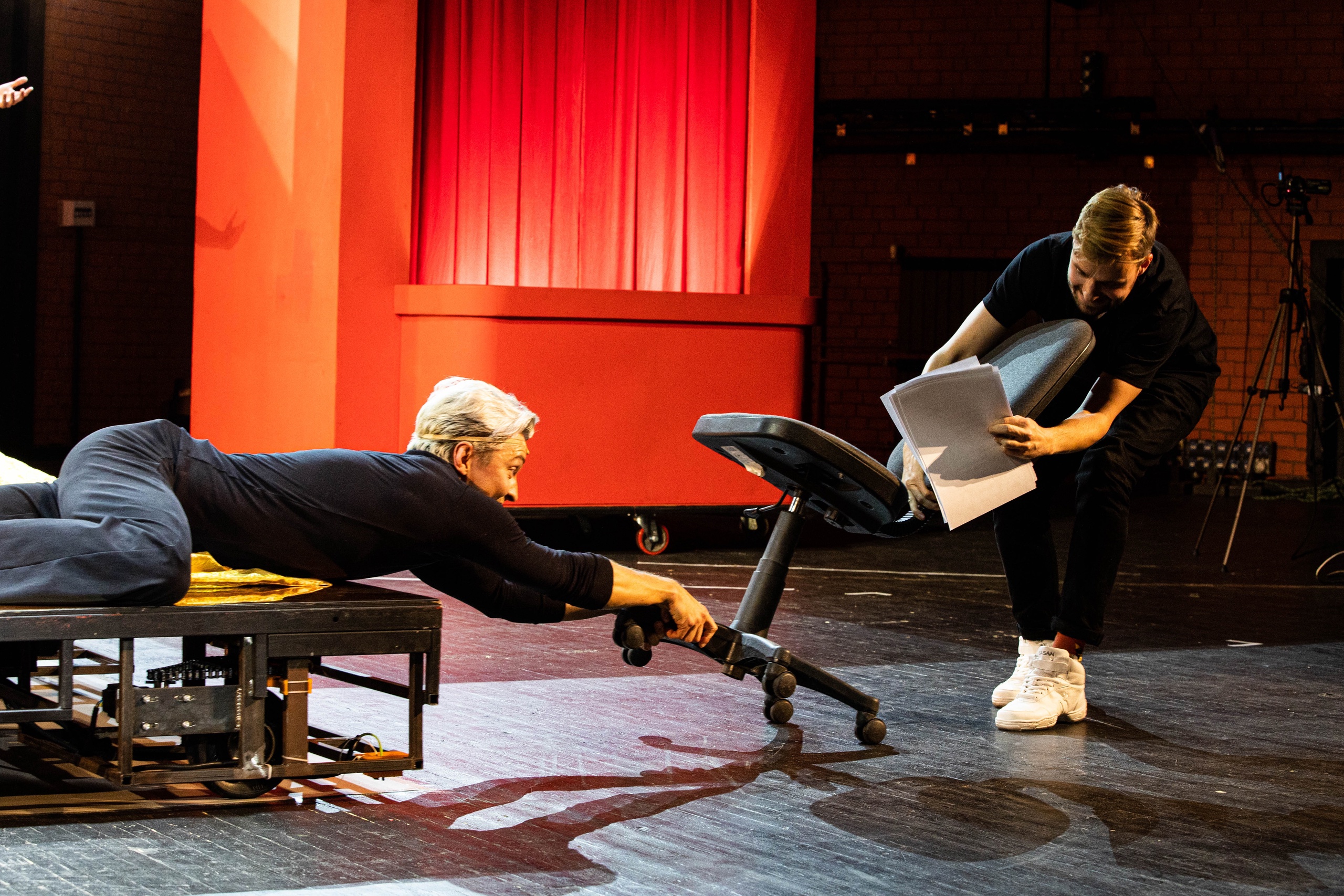 Весь спектакль — это фейерверк, фарс. Начавшись как обычная постановка, она вдруг прерывается и все оказываются на репетиции. Фигуры режиссёра здесь нет, она за скобками. У сцены стоит столик помрежа, пульт звукорежиссёра, по сцене ходят техники, занимающиеся перестановкой и отвлекающие артистов. История рассказывается архитипично, без привязки к конкретным именам, хотя в спектакле задействован звёздный состав труппы — Дмитрий Бозин, Людмила Погорелова, Екатерина Карпушина, Анна Подсвирова, Антон Даниленко, Станислав Мотырев.