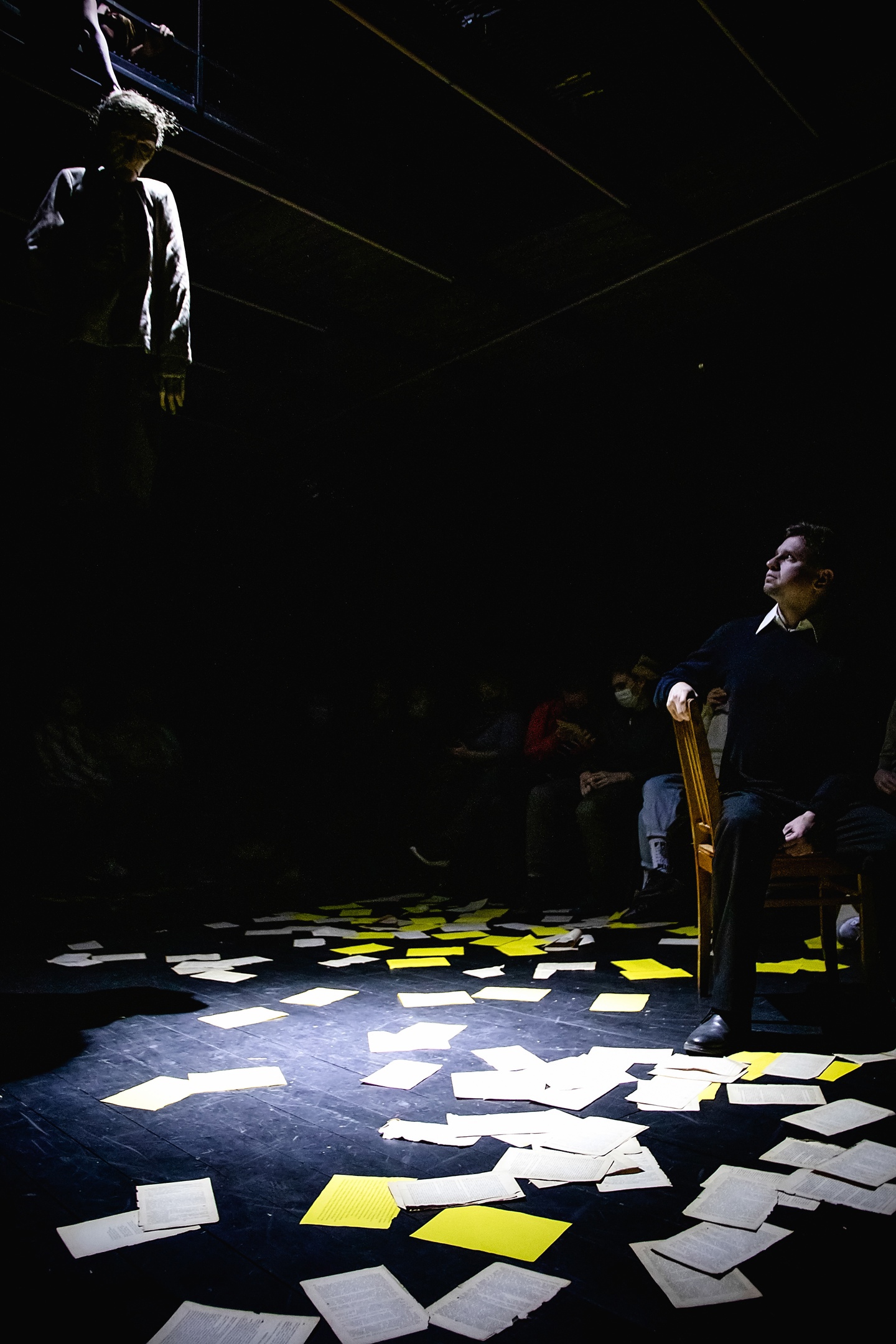 Спектакль начинается с актуальной сегодня иммерсивности. Зрителя погружают в состояние дискомфорта, напряжения и тревоги, постепенно увеличивая накал эмоций. Стулья расположены по периметру. Как таковая сцена – это решетка на потолке. Сначала зрители сидят в полной темноте под звуки нагнетающей фрустрацию музыки, а потом должны оборачиваться, вытягивать шеи или запрокидывать голову назад, чтобы увидеть происходящее. Более того, ощущение опасности усиливается за счет мелькания лампочек и линейных светильников, чрезмерно громких звуков падения и стука, а также голосов, которые настойчиво требуют от Родьки совершить убийство.