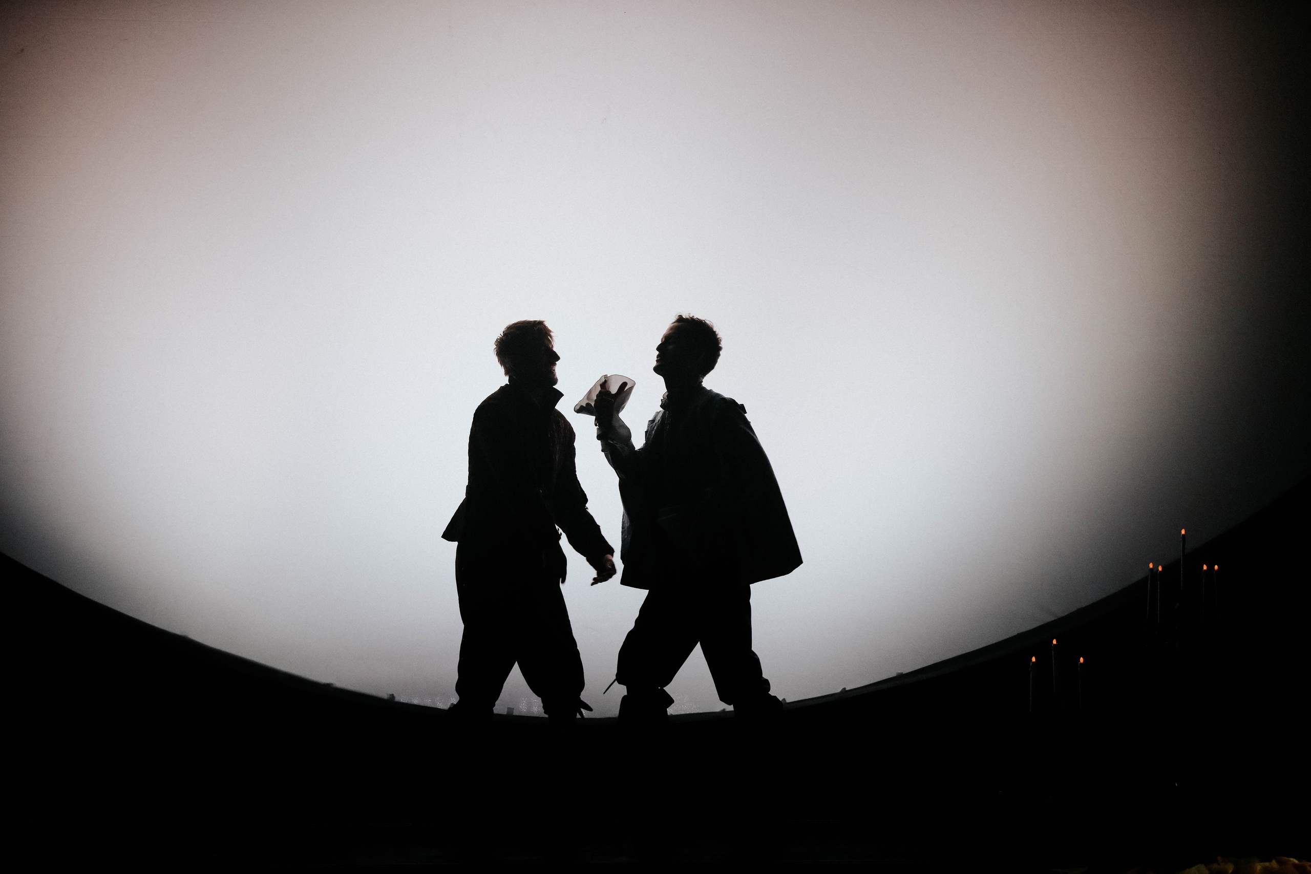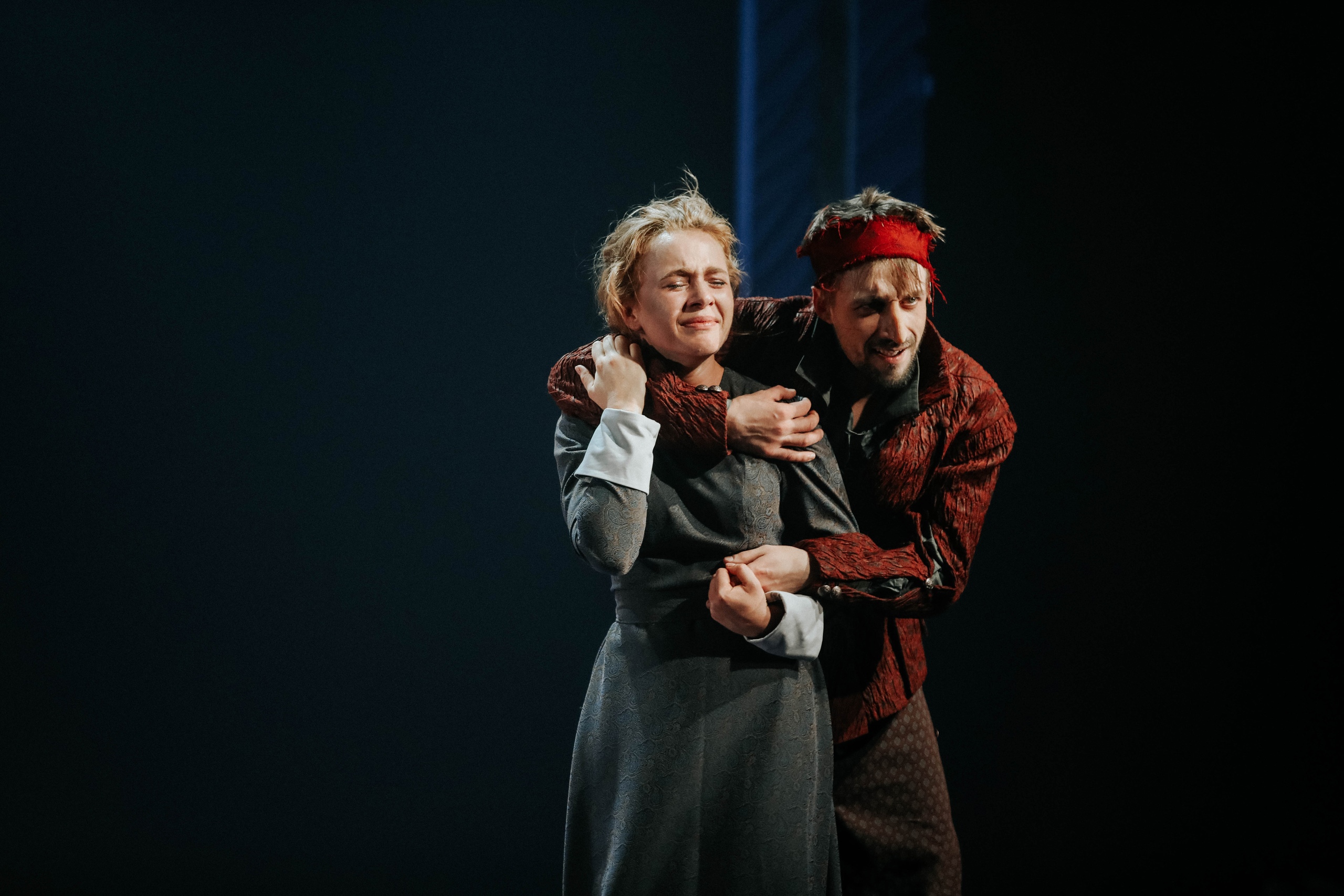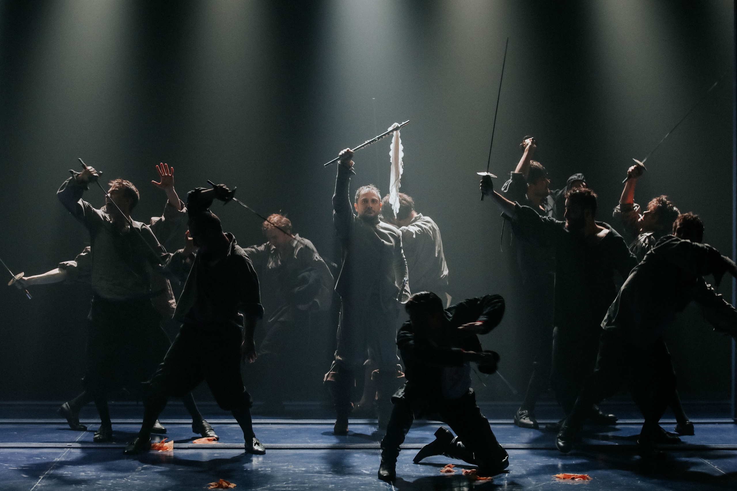 Помимо несчастливого любовного треугольника самым заметным и значимым персонажем предстаёт… массовка, множество действующих лиц. Они молниеносно меняют наряды, задают тон происходящему, у них много текста и движения. Они очень заметны в пространстве сцены, которое оформлено просто и лаконично – три передвижные ажурные стенки-двери. Крепкая ансамблевая работа – приятно наблюдать, как персонажи – маркизы, гвардейцы, мушкетёры, поварята – дополняют, подстраховывают и поддерживают друг друга. Они перекидывают свои слова как мячик для пинг-понга, и один заканчивает фразы другого. Их игра ускоряет действие, не даёт провисать сюжету, который и так не стоит на месте, а несётся вперед, а на острие в его авангарде мчится Сирано.