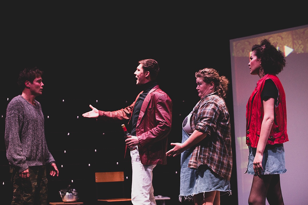 Автор романа говорил в интервью, что под этой «общагой» подразумевалось студенческое общежитие на Урале, где он жил в начале 1990-х. Типажи в спектакле представлены условно: первокурсник Отличник (Геннадий Блинов), местная красотка Неля (Анна Донченко), ловелас Игорь (Владимир Карпов), добрая и жалостливая Лёля (Юлия Башорина) и, подозрительно напоминающий рок-звезду Александра Башлачёва (общага уральская же!), Ваня (Алексей Фролов) – вечно пьяный поэт и музыкант.