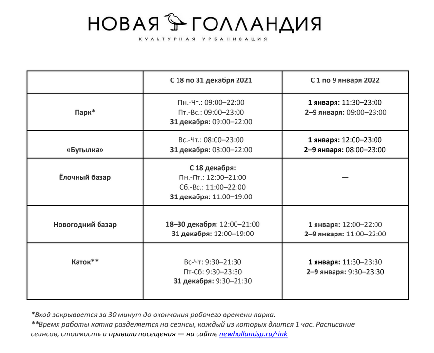 Каток: с 13 ноября по 13 марта на острове Новая Голландия открыт каток. Он занимает площадь более 2000 м2 и находится прямо перед сценой. Каток работает ежедневно и снабжён системой охлаждения, которая позволяет кататься даже в тёплую погоду.