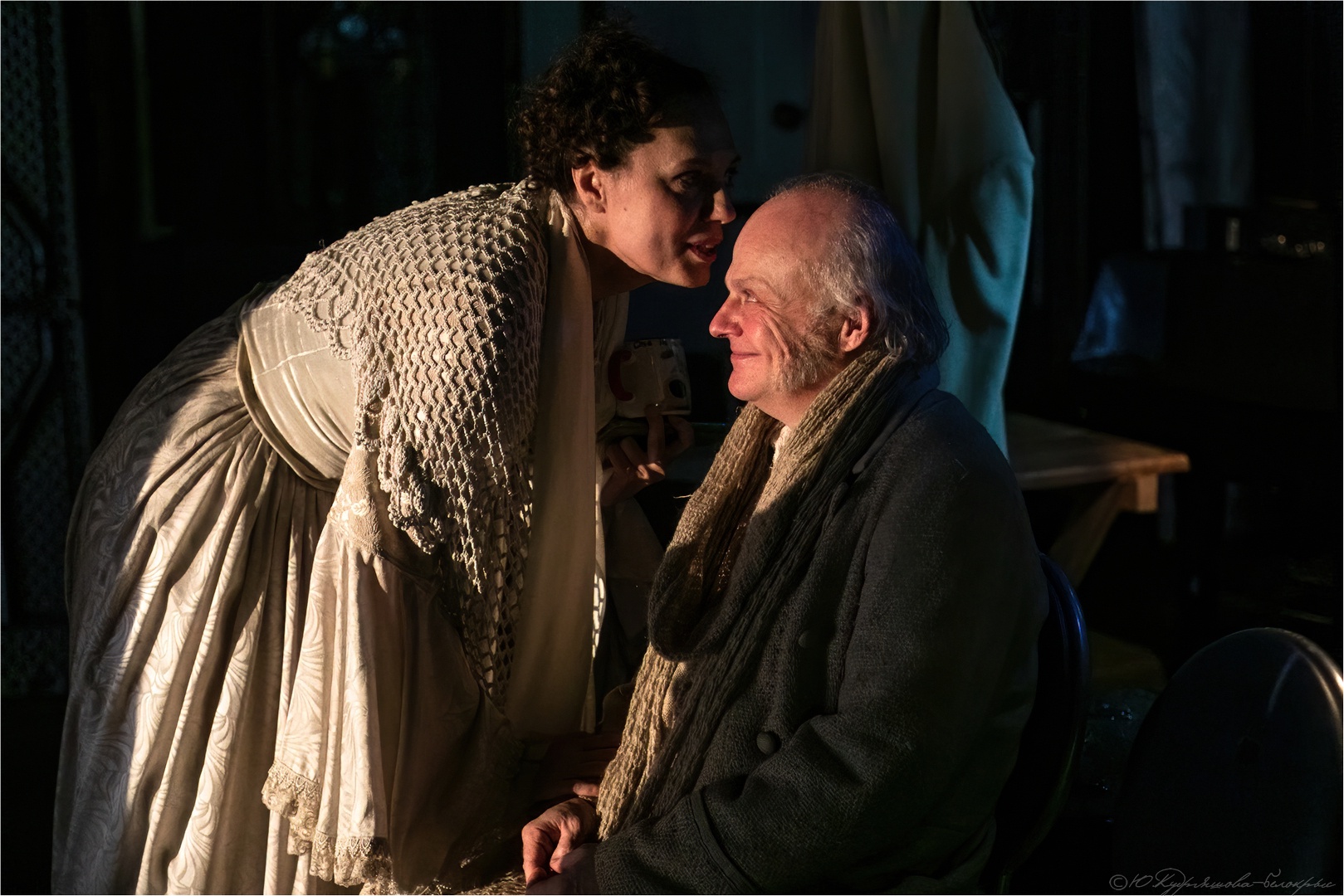 Одноименная комедия Алексея Толстого была написана в тревожное предреволюционное время – в 1916 году. Но и спустя более чем век, тема любви и радости оказывается востребованной у современной публики – недаром же «Касатка» пользовалась такой популярностью у театральной аудитории. И деревенский Эдем, возникший на сцене, по-прежнему манит своим обещанием счастья и покоя. Провинциальная красота сквозит во всём оформлении пространства (сценография Марта Китаева и Михаила Платонова) – на сцене всё распахнуто, всё настежь – посередине раскинулось огромное дерево с райскими яблочками, тут же светлые лесенки, простой деревянный стол, добротные белые скатерти, кружева, воздушные змеи, много света и воздуха. И между всего этого бегает смешливая горничная Дуняша (Светлана Стуликова), довершая своим милым и суетливым образом пасторальную картинку.