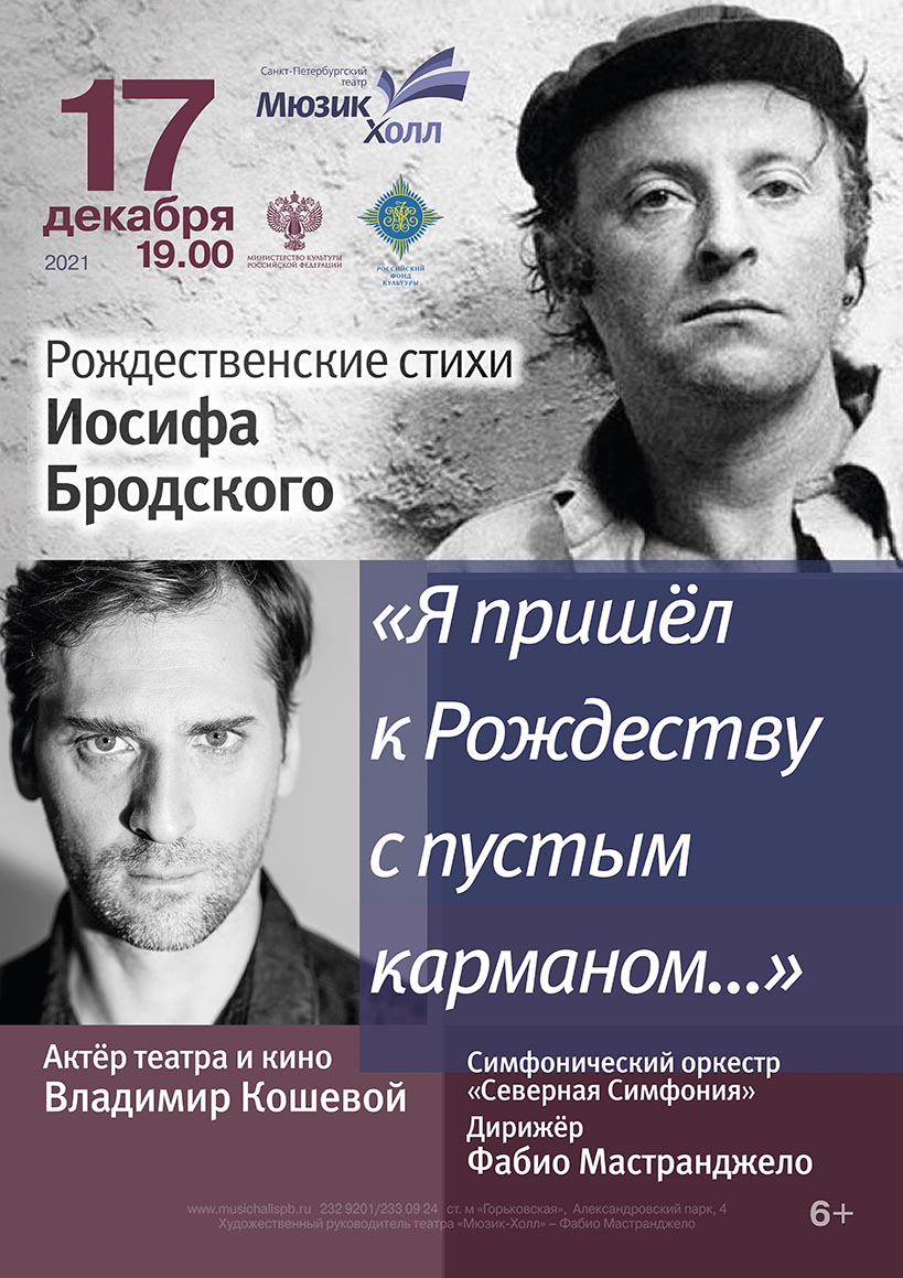Концерт «Я пришел к Рождеству с пустым карманом» назван по строчке из стихотворения лауреата Нобелевской премии по литературе Иосифа Бродского. В сопровождении симфонического оркестра «Северная Симфония» под управлением маэстро Фабио Мастранджело актер театра и кино Владимир Кошевой прочитает цикл рождественских стихов Бродского, в котором как нигде раскрывается магия личности Иосифа Бродского, его осмысление темы Рождества.