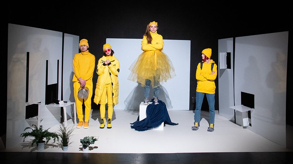 Художник Алина Михайлова и мастер по свету Николай Афанасьев превратили сцену (по факту — три пластмассовых стены, подвешенные в пространстве и кусок белого пластика на полу) в трансформер, который превращается то в комнату, то в дом, то в улицу, а из обозначений место действия — только пара предметов, цветочные горшки и фломастеры. Все верно: детский спектакль нужно создавать инструментами из детских игр!