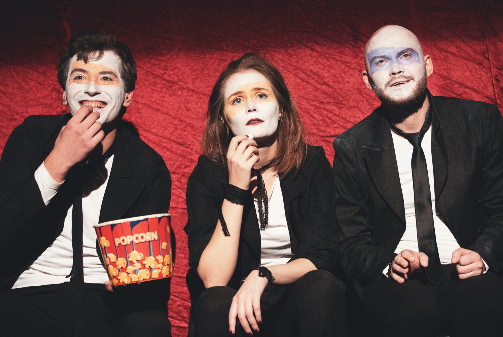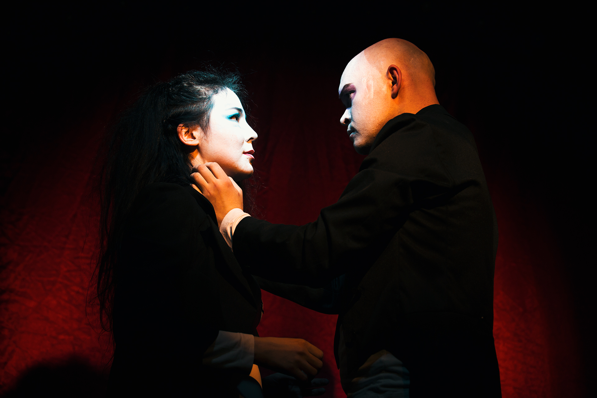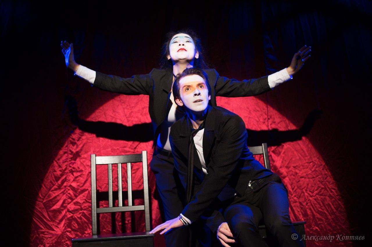 «Фильмовая мелодрама 1928 года о жизни, любви шпионки МАТА ХАРИ в пяти фильмах» — объявят с импровизированной кроваво-красной сцены (художник Надежда Лопардина) с лампами-софитами, микрофонами и музыкальными инструментами герои в чёрно-белых костюмах — не забыв представиться, словно надев условные маски на выбеленные лица.