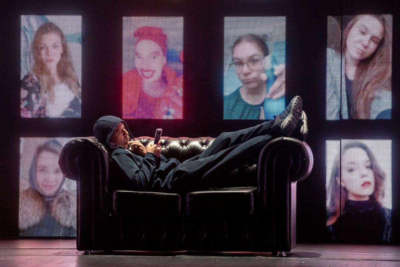 Зрители, вслед за героем, смотрят на множество экранов, расположенных по периметру сцены, на которых появляются видеообращения девушек, чаты и, в том числе, собирающее лайки видео самого Подколесина с грустными глазами и растерянным лицом, размышляющего вслух о том, что жениться, конечно, хорошо бы, но не сейчас, а когда-нибудь завтра.