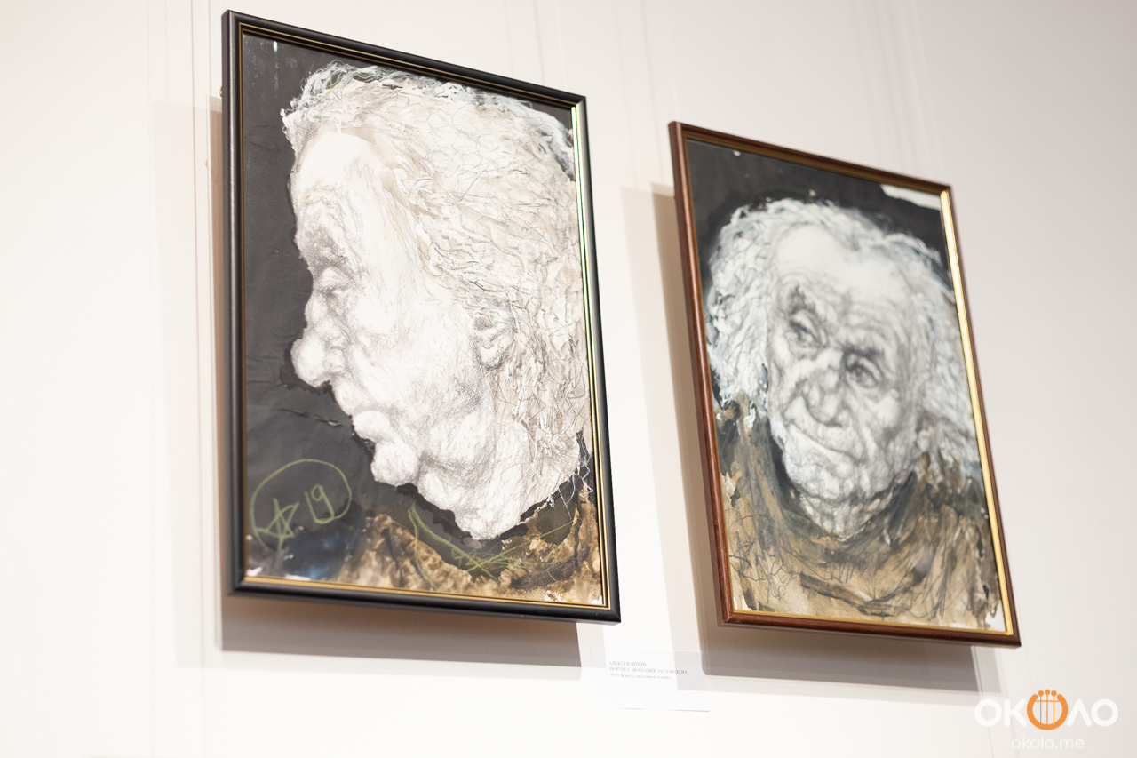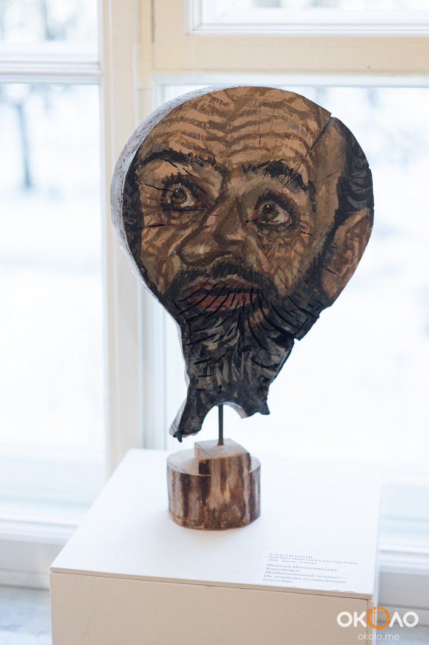 Особое место в творческой биографии и на выставке занимают портреты на спилах деревьев, причем абрис лиц совпадает с формой деревянной основы, а кольца лет проходят не только по дереву, но и по изображенному лицу. И как годичные кольца – знак уникальности дерева, так и для автора каждый его персонаж уникален.
