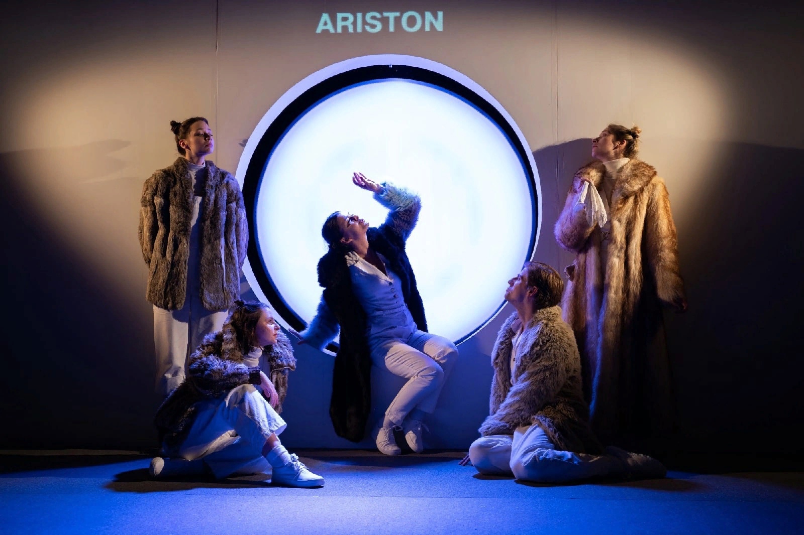 Декорации на сцене были представлены несколькими стульями-пуфами и белой стеной с большим кругом-порталом посредине. В нужный момент она превращалась то в материнскую утробу, то в эффектную светодиодную лампу, то в стиральную машинку «Ariston”… На белоснежных стенах проектор выводил сноски, некоторые комментарии, дополняющие или поясняющие речь героев. Например, транслировал загаданные в новогоднюю ночь желания персонажей, или пояснял, что слово «Митино» очень похоже на «Meeting», то есть встречу. Над сценой проплывали мелодии то группы Scorpions «Still loving you», то allegro из концерта L’amoroso Антонио Вивальди, а также демонстрировалась краткая биография автора романа Григория Служителя.