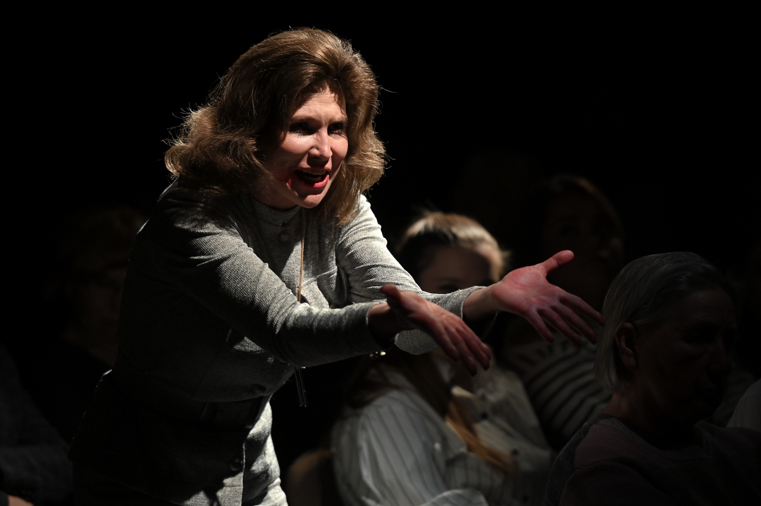 Спектакль начинается под звуки акустической гитары, на которой играет девушка в красном платье, сидящая на стуле у края сцены — Валентина Лимонова. При этом сами зрители размещены по кругу на сцене и на первых рядах зрительного зала, словно собрались послушать выступление бардов или поэтов. При такой рассадке практически невозможно отвлечься от происходящего. К микрофону выходит актриса в элегантном деловом костюме и шокирует собравшихся исполнением песни с обсценной лексикой и тюремным жаргоном оперным вокалом.