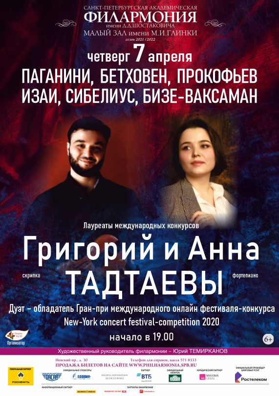 Григорий и Анна ТАДТАЕВЫ исполнят музыку Бетховена, Паганини, Бизе-Ваксмана, Сибелиуса, Прокофьева, Рамо 7 апреля в Малом зале Санкт-Петербургской академической филармонии. Путешествие, которое берет начало в русле венского классицизма, плавно перетекающее в экспрессивное море музыки виртуозов-романтиков скрипки, небольшая остановка у озера созерцания волшебного мира камерной музыки Сергея Прокофьева, следующая за этим экспедиция по югу Финляндии, открывающая необыкновенный национальный колорит глазами великого Яна Сибелиуса и захлестывающая волна эмоций от жгучей Кармен в финале.
