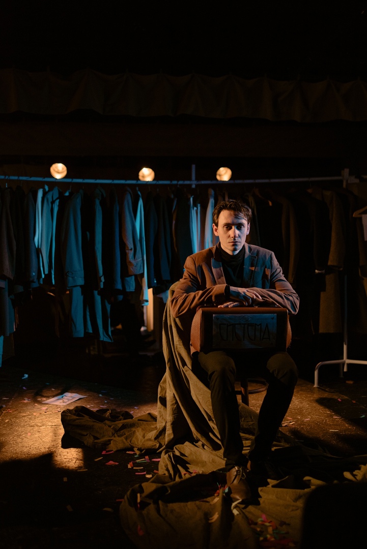 А над вешалкой, словно на постаменте, будет временами появляться картонный Станиславский, готовый вынести суровый вердикт: например, что Вахтангов не чувствует форму спектакля и способен быть только педагогом… Порой занавес-вешалка как бы распахивается, и мы заглядываем в священное место для любого актера — гримерку. Неожиданно пространство зала трансформируется… в кинотеатр! И на проекторе нам показывают потрясающе смешные и красивые чёрно-белые фильмы, сочинённые исполнителями — о сжигающей зависти, ревности и любви. Были подобные попытки перенести постановки в немой кинематограф в начале XX века, но не имели успеха. Особое наслаждение — наблюдать за комичной дружбой-конкуренцией между заклятыми друзьями: субтильным, постоянно недооцененным, получившим поначалу обидное прозвище «племянник» Чеховым, и нервозным Вахтанговым, который, присев за режиссёрский столик, будто наконец находит свое место.