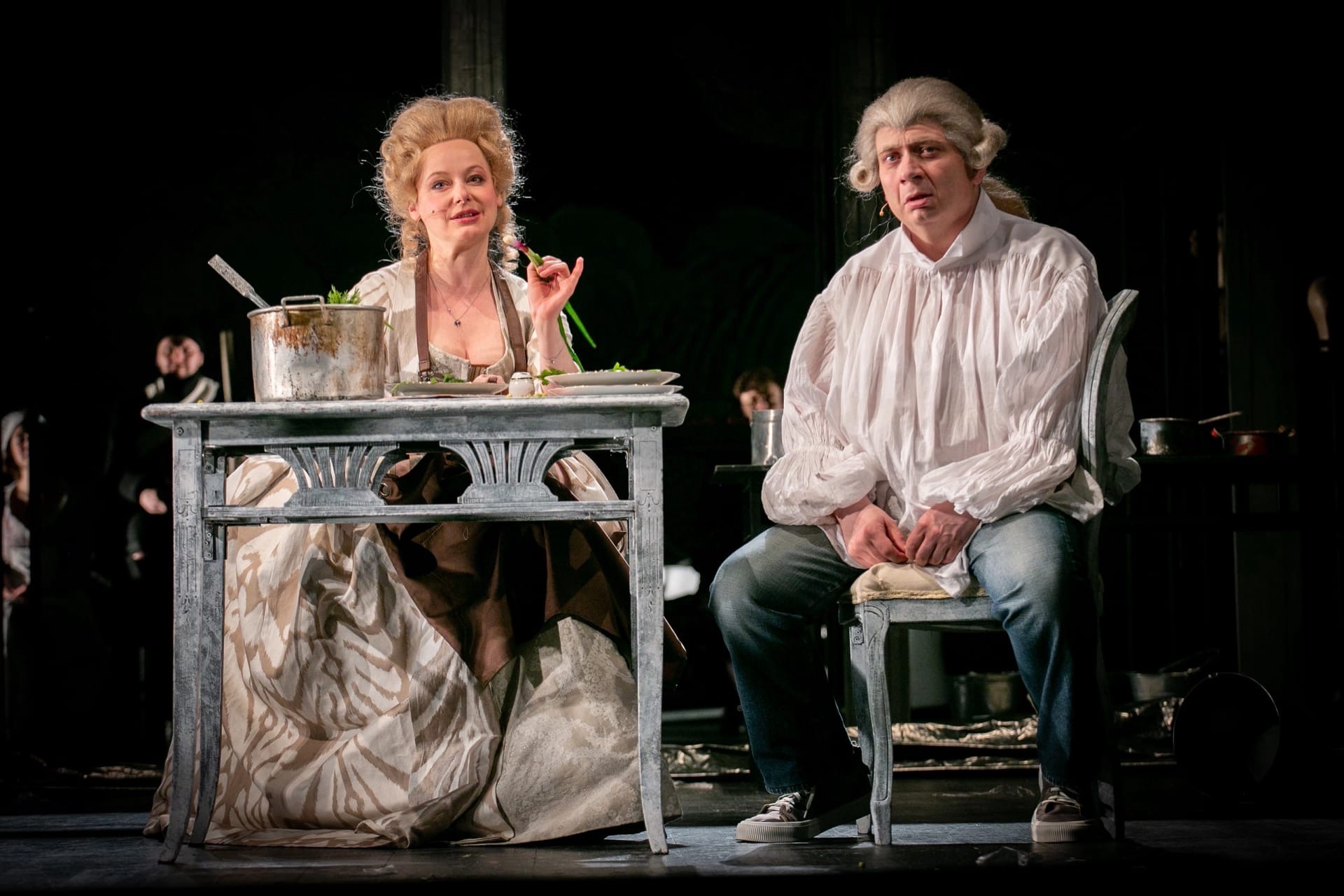 На сцене возвышаются декорации то ли величественного дворца то ли храма. И тут же — воспевание бытовости, не менее прекрасной: обеденный стол, кастрюли, плита с конфорками. Мать Тристрама то замирает в позе Мадонны со взрослым Тристрамом у груди, то готовит загадочное блюдо, ссыпая в кастрюлю все ингредиенты разом вместе с упаковками от продуктов.