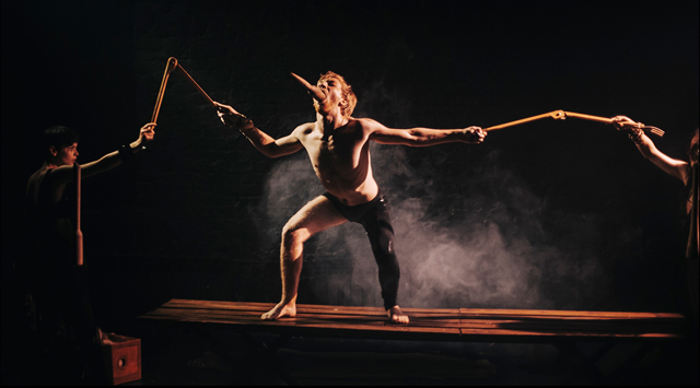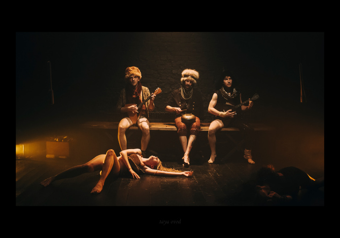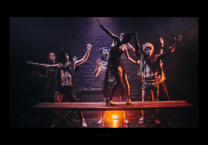 Максим Исаев, взяв за основу сказку Александра Пушкина, создает перформанс, состоящий из множества пластических этюдов, абсолютно непредсказуемых, порой некомфортных из-за очень назойливых резких звуков, запахов и ярких всполохов света. Один из предметов, который задействован почти в каждой сцене — «чудо-колотушка», основное предназначение которой — мять, бить, давить. Так и герои, расставив на сцене в определенном порядке колотушки, с яростью огрызаются на женщин, которые стремятся помочь, подсказать — советы им не нужны, женщин они жестоко избивают — в виде пугающего мучительного танца (хореография Галы Самойловой). Колотушками не только колотят, они — и фаллический символ. Дадон не в силах побороть вожделение, Шамаханская царица в буквальном смысле схватит его за горло и уведет в свой шатёр. И про погибших сыновей и страну в опасности он, будто загипнотизированный, уже не вспомнит.