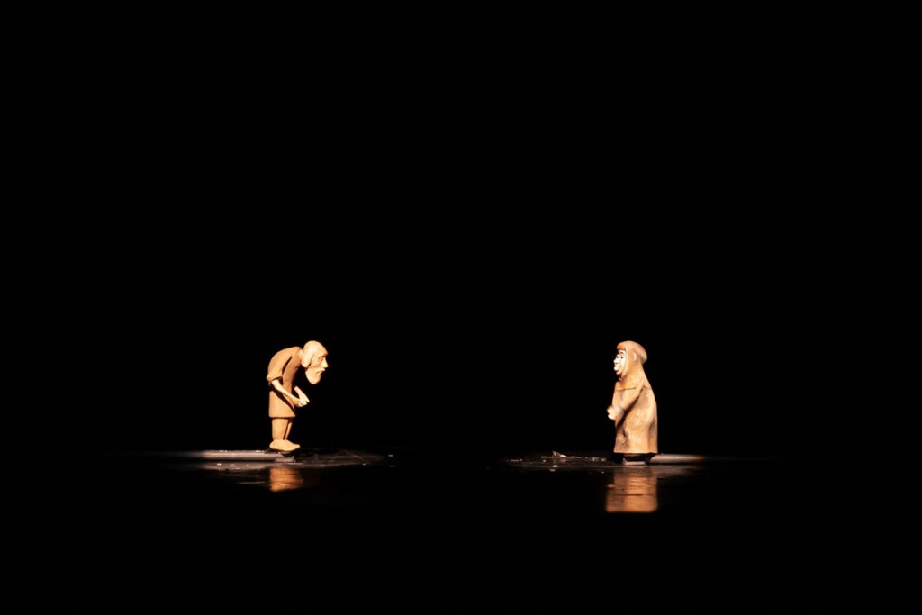 А Старуха поддается искушению — и становится ненасытной, как персонажи «Волшебной лампы Аладдина» в пещере. Постепенное расчеловечивание происходит с помощью кукол — Старуха то обращается в деревянную куклу, то в прожорливое неповоротливое существо с маской вместо лица, а порой и вовсе голос у нее пропадает — слышен лишь хищный писк. То самое корыто, которое в начале расколется как семейная лодка, разбившаяся о быт, вырастет до гигантских размеров — и впрямь лодочных. А потом предстанет крепкой избой, но в ней Старухе вместе со Стариком будет уже тесно и некомфортно. Какой тут рай в шалаше, когда можно стать царицей и жить во дворце! Снова и снова отправляется Старик на берег моря, всё ещё бесконечно любя свою жену, которая превратилась в монстра. Рефреном звучит песня «Грешный человече» в исполнении Сергея Старостина.