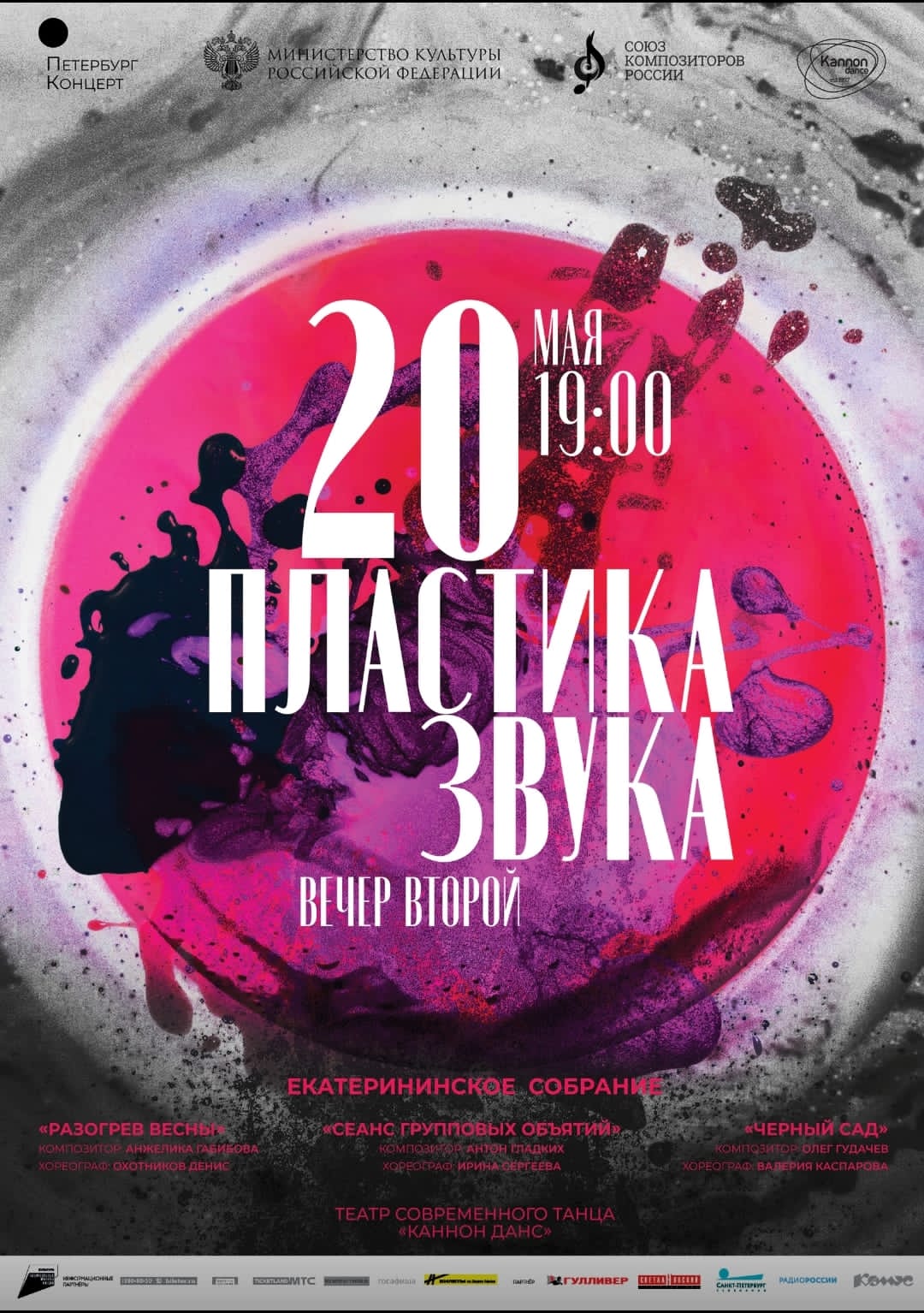«Пластика звука» – новый проект Дома танца «Каннон Данс», Союза композиторов России и Петербург-концерта. Цель проекта – предоставить молодым композиторам и хореографам Санкт-Петербурга возможность для создания совместных музыкально-хореографических произведений. На предварительном этапе авторам было предложено встретиться и познакомиться друг с другом, обсудить идеи, круг тем, наметить этапы работы. Результатом этого процесса станут два вечера эксклюзивных премьер, каждая из которых раскроет новые, неожиданные грани взаимодействия пластики и звука.