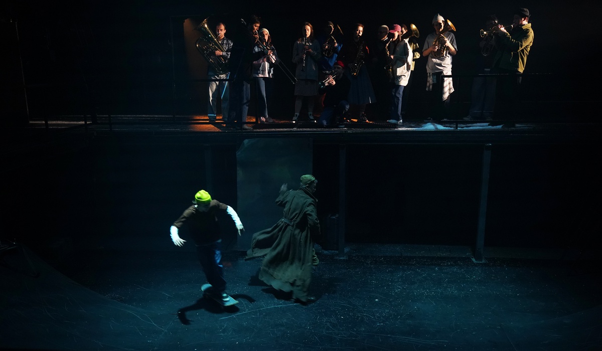Разобранная сцена выглядит наподобие скейт-парка — с небольшой горкой, на которой легко не только делать головокружительные трюки на скейтах, но и перемещаться ближе к зрителям, оказываясь буквально в паре метров от первых рядов — как в камерных театрах. Используется также верхняя часть сцены, действие запараллеливается — когда внизу молодёжь устраивает вечеринку с танцами и ярким слепящим диско-светом, герой в старости (Михаил Самочко) молча наблюдает за ними в постепенно поглощающей его тьме. Ребята на фронте стыдятся своих обмоток, а их возлюбленные девы (Екатерина Клеопина, Полина Севастьянихина, Дарья Ленда, Надежда Некрасова) танцуют с заветными крепкими кирзовыми сапогами.