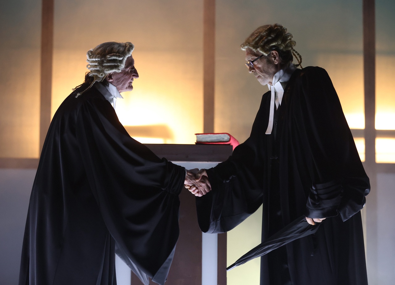 Мы ничуть не приукрашиваем, говоря о громе. Спектакль выполнен в классических традициях нуара, идеально сочетающегося с обывательским представлением о Лондоне. Благодаря работе видеохудожника Марии Фоменко, на протяжении всего действия зритель наблюдает серое лондонское небо, герои не расстаются с зонтами, потому что на улице непрестанно льет как из ведра, а в воздухе осязаемо витает атмосфера растерянности и тревоги. Беспросветная лондонская тоска безупречно коррелирует с сюжетом постановки: в душе всех без исключения героев – сомнения, их тяготит мрачная неопределенность рассматриваемого дела. Кульминацией внутренней напряженности является не на шутку разыгравшаяся за окном непогода во время заседания суда. Дополняет царящую на сцене атмосферу беспокойства грамотно выстроенная работа со светом (художник по свету – Денис Солнцев), так что в моменты особого отчаяния и откровений сцена погружается в полумрак, и ее пространство освещают лишь лампы на столах.