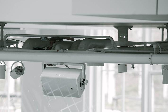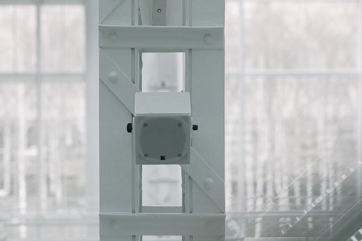 Маршрут медиаторы режиссируют самостоятельно, упаковывая в последовательность локаций свое видение выставки. Впрочем, вы можете пройтись по экспонатам самостоятельно: в каждом зале есть достаточно подробная экспликация. Всего семь локаций (шесть в помещении и одна на улице), нам удалось побывать на пяти из них. Медиация началась с основного зала ГЭС-2 – это “проспект” и одновременно “торговая площадь”, которая будто бы продолжает пространство улицы. В разных частях холла расположены колонки, издающие рандомные звуки – это инсталляция “Резонанс” Вангелино Курентзиса. Рассредоточенные источники звука заставляют нас внимательно вслушиваться в музыку и собеседников: именно в таком положении по замыслу композиторов находится современный человек в процессе поиска общего языка с ближними. Сочинение длится 20 минут и, как и остальные композиции, зациклено. Даже если вы пришли в ГЭС-2 не слушать “Настройки”, эта пьеса затронет вас: звуки растворяются и поглощаются пространством, сливаясь с шумом холла и разговорами гостей.