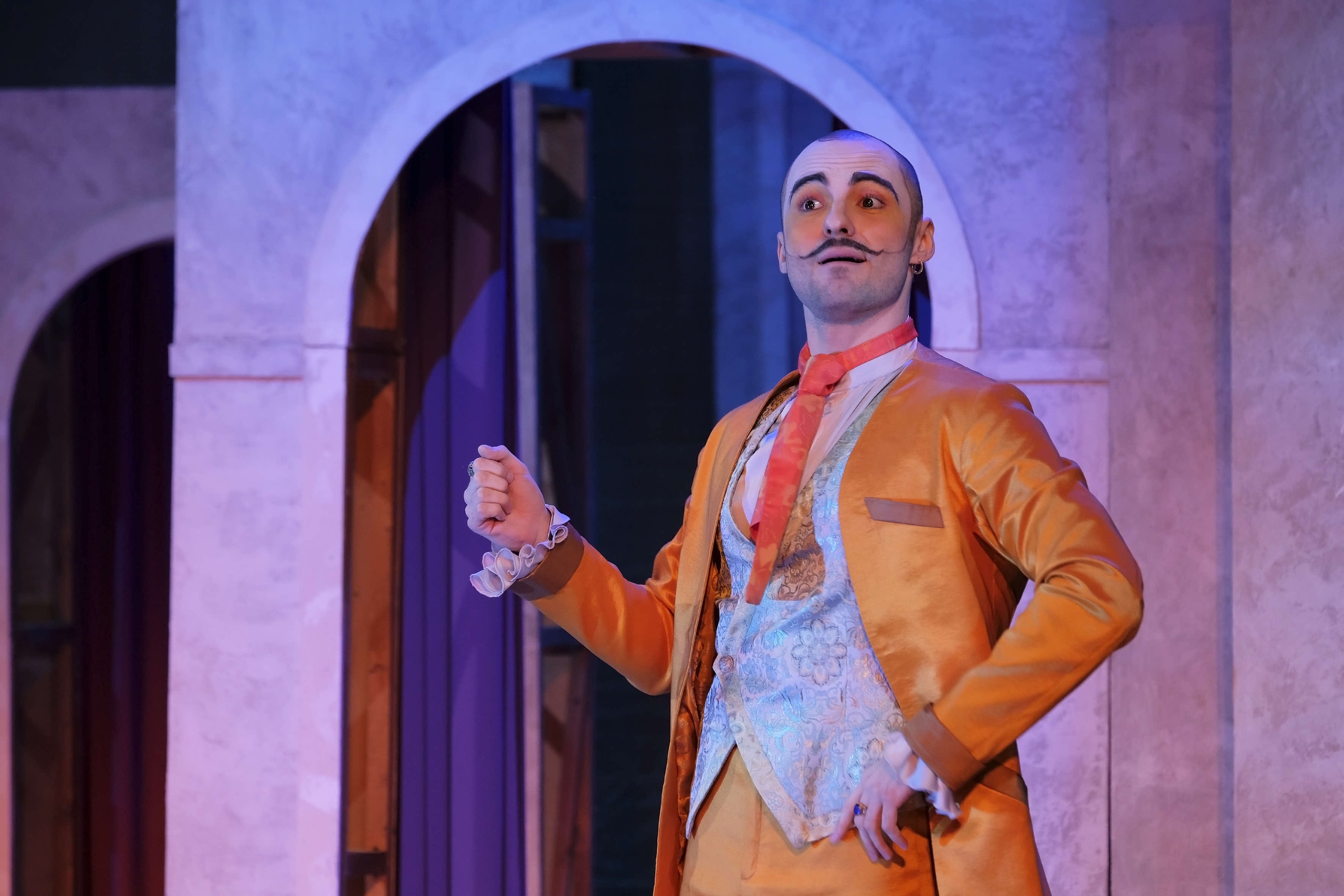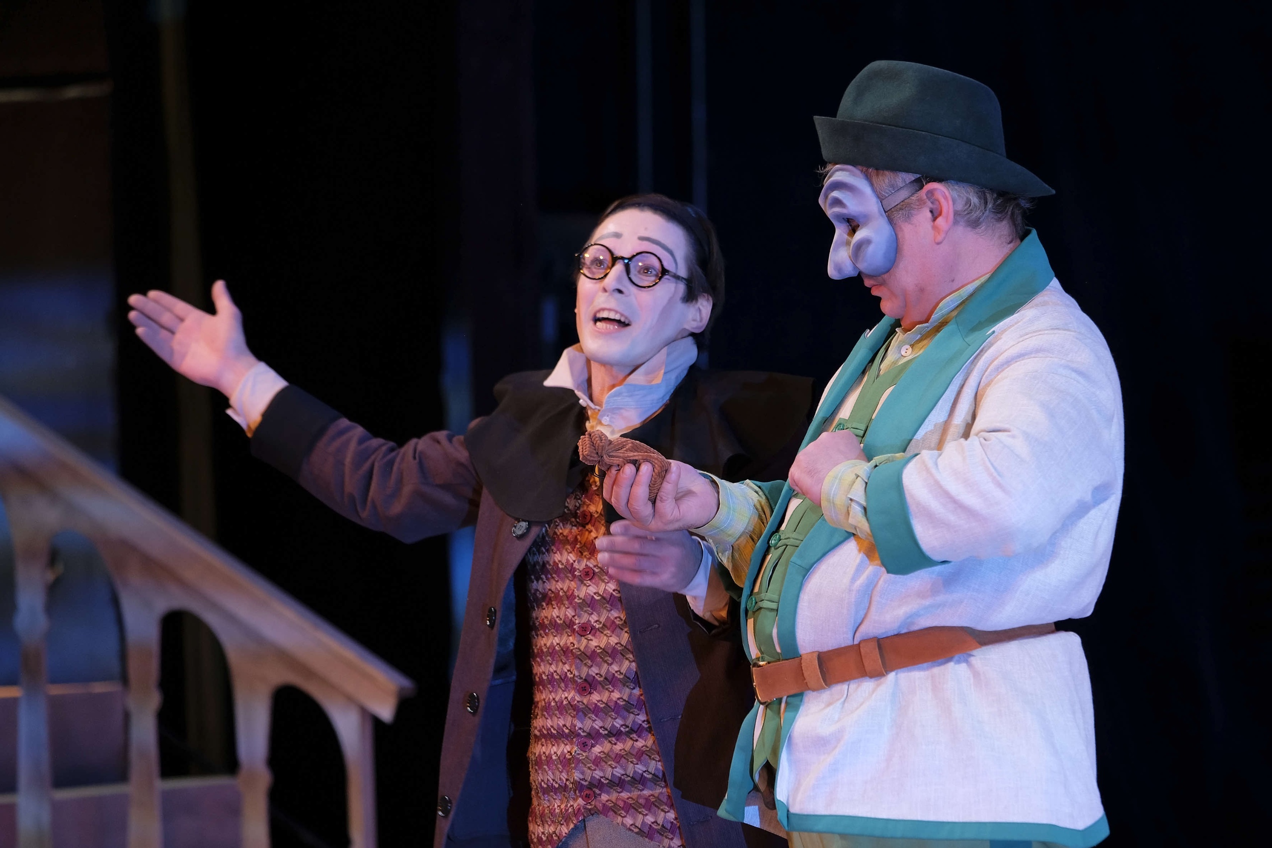 Контрастом Лелио служат два других жениха – застенчивый «чудик» Флориндо (Радик Галиуллин) и искренний, обладающий превосходным голосом Оттавио (Кузьма Стомаченко). И совсем противоположным полюсом являются отрекшийся от него отец — купец Панталоне, вобравший в себя черты тиранов и благородных отцов, а также карикатурный Доктор. Согласно традиции, Панталоне – олицетворение комически истолкованной старости с оскудевшим умом. Худой и сгорбленный, он уже не может разогнуть спину и сдержать дрожь. Доктор – наоборот полный и самодовольный, олицетворяет невежество, и несмотря на ученую степень, городит вздор.