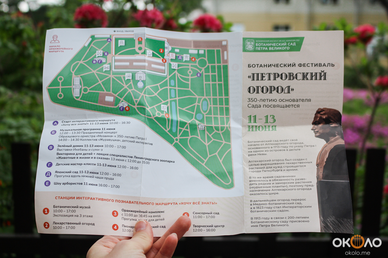 Сотрудники Ботанического сада подготовили удобную карту-путеводитель по фестивалю с программой и маршрутным листом интерактивной детской познавательной прогулки «Хочу всё знать!». На каждой из станций маршрута нужно было ответить на вопрос и собрать штампы Ботанического сада. Также для детей были организованы мастер-классы, викторина и лекция специалистов Ленинградского зоопарка «Животные в жизни и в сказке».