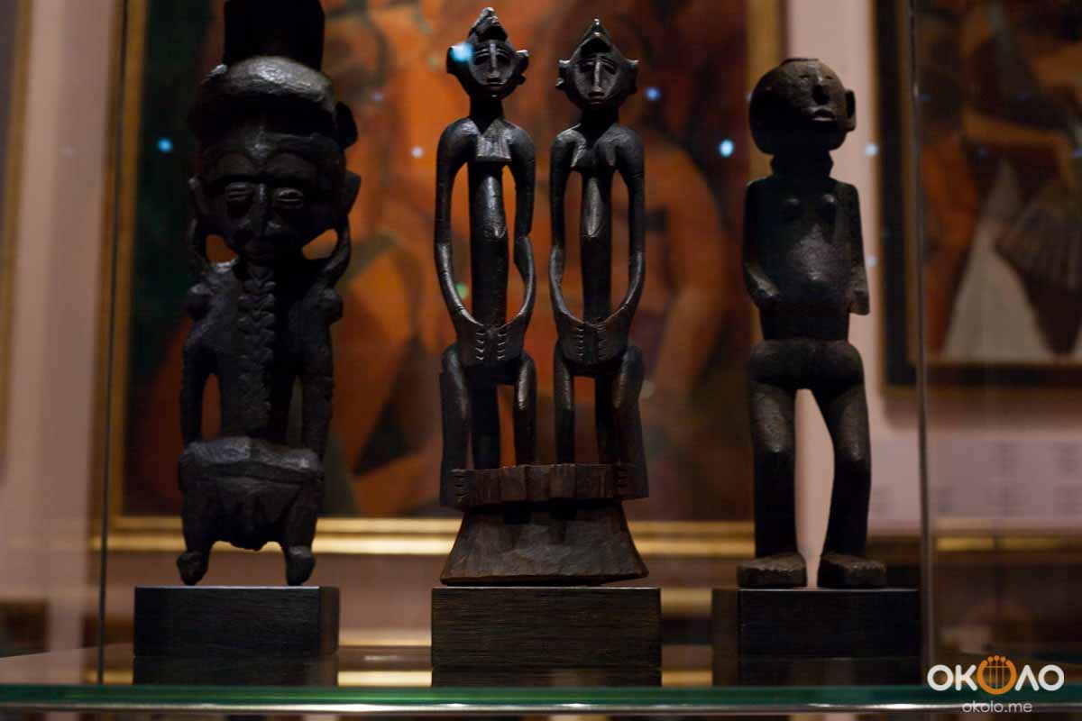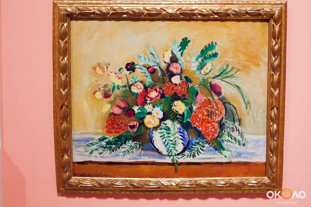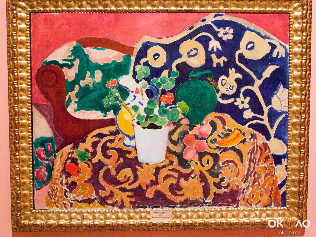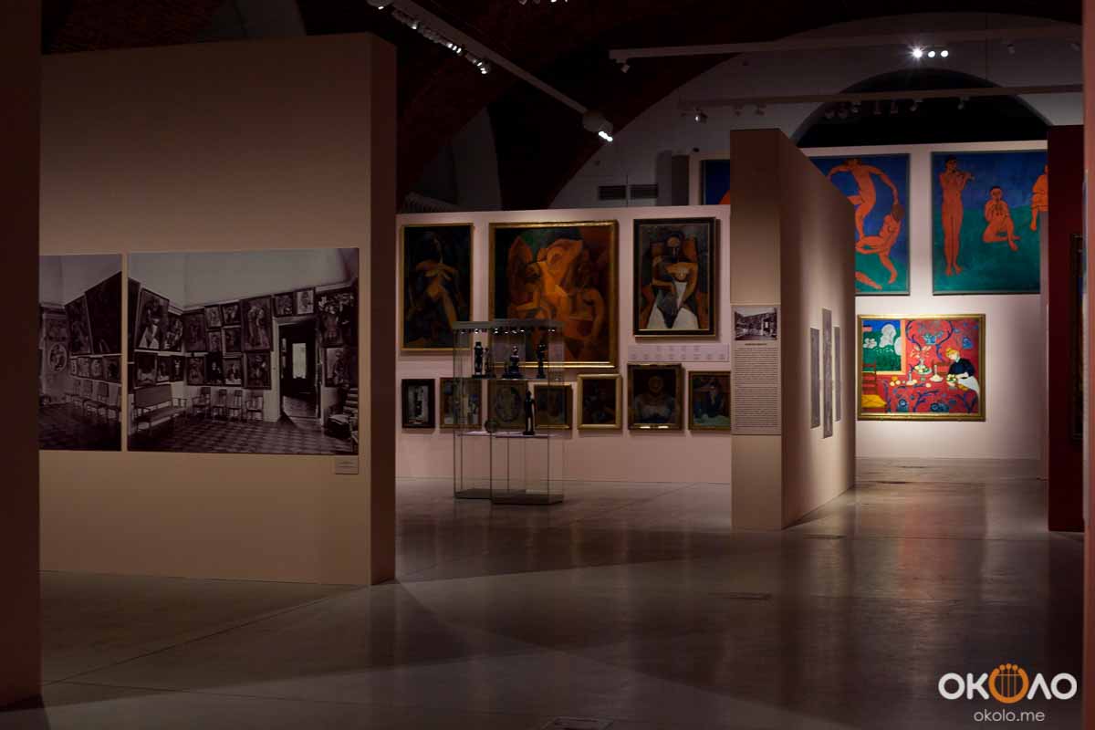 Оказавшись в шикарном особняке, гости в первую очередь попадали на большую лестницу, где могли видеть знаменитые панно Анри Матисса «Танец» и «Музыка». И на выставке эти крупноформатные работы видны практически из любой точки зала. Среди других картин Матисса в Манеже представлены «Арумы, ирисы и мимоза», «Розовая статуэтка и кувшин на красном комоде», «Красные рыбки», «Ваза, бутылка и фрукты», а также «Игра в шары», которые располагались в Розовой гостиной дома Щукина.