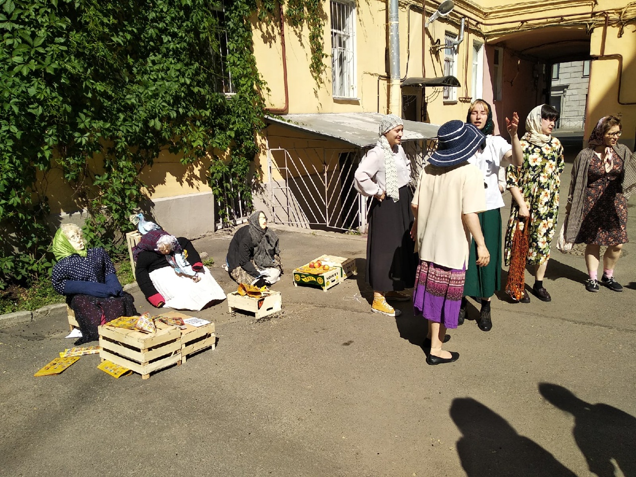 На протяжении всего дня город активно вмешивался и «участвовал» в Маршруте – случайные прохожие с интересом наблюдали за множеством людей с газетами-программками в руках, за актёрами, за необычными событиями. Для меня забавнейшей вершиной этого участия стала встреча с сидевшей на скамеечке пожилой дамой — не актрисой, как я поняла, которая, наблюдая, как мы все грузимся в абстрактный «Трамвай» (режиссёр эпизода Варвара Сополева), возмущённо говорила, что будет жаловаться в Комитет по культуре, что мы занимаемся ерундой и на всех нас нужно написать жалобы. Это было так в стиле хармсовского абсурда! И если это была настоящая актриса, то просто «Браво!» за полное погружение в роль недовольной бабки.