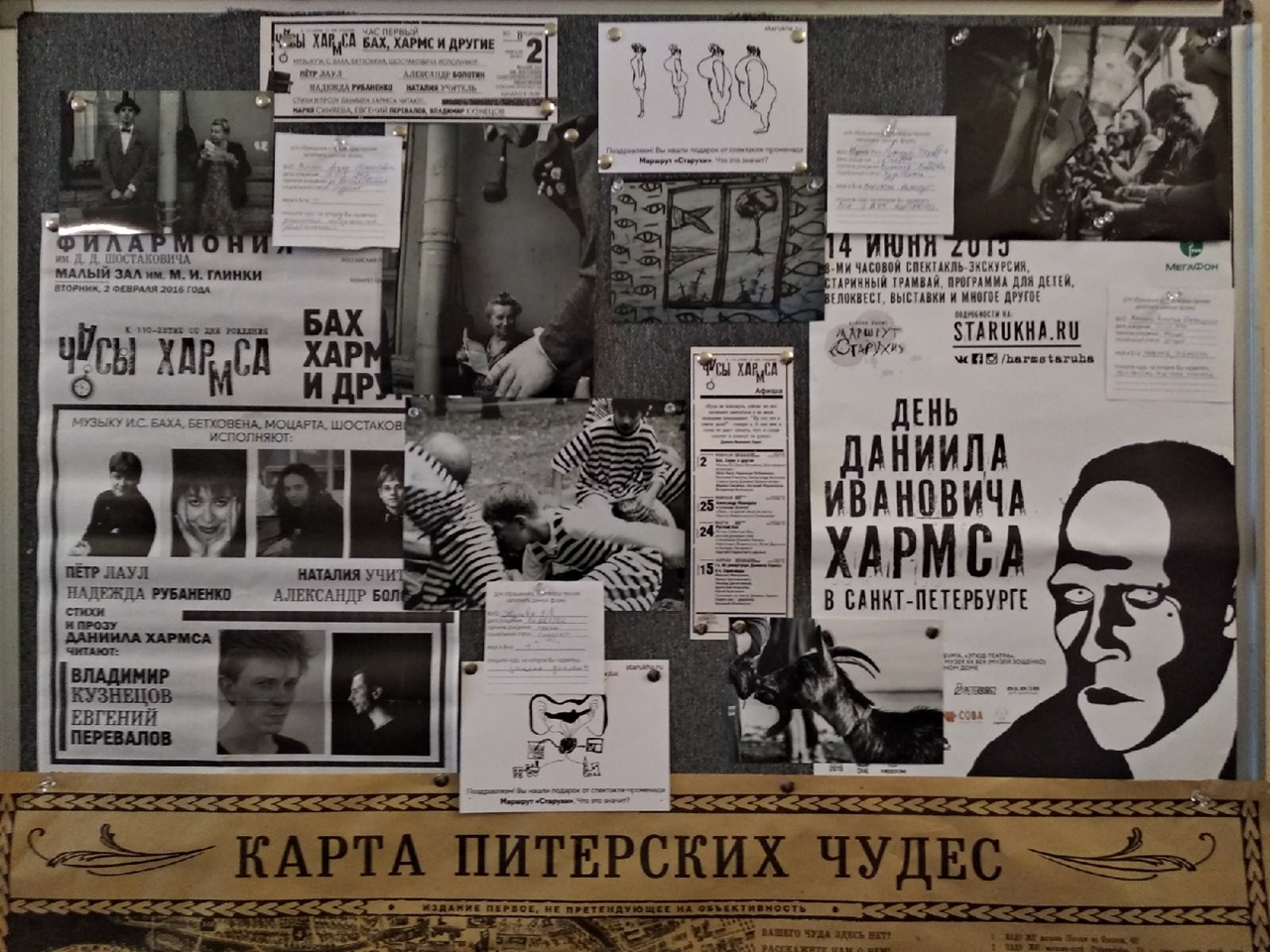 Перед началом их осмотра всем зрителям организаторы раздали газеты с картой и программкой предстоящего маршрута, попросив вступить в соответствующий этой газете Телеграм-канал. Каналы носили имена ОБЭРИУтов и их друзей — Липавского, Введенского, Друскина, Заболоцкого, Олейникова, Житкова, Левина и Владимирова. Именно они составляли Объединение Реального Искусства — группу писателей и деятелей культуры, существовавших в 1927 — начале 1930-х годов в Ленинграде. Участники этой группы подвергались гонениям со стороны властей, им запрещали печататься, многие из них были репрессированы и погибли в заключении.
