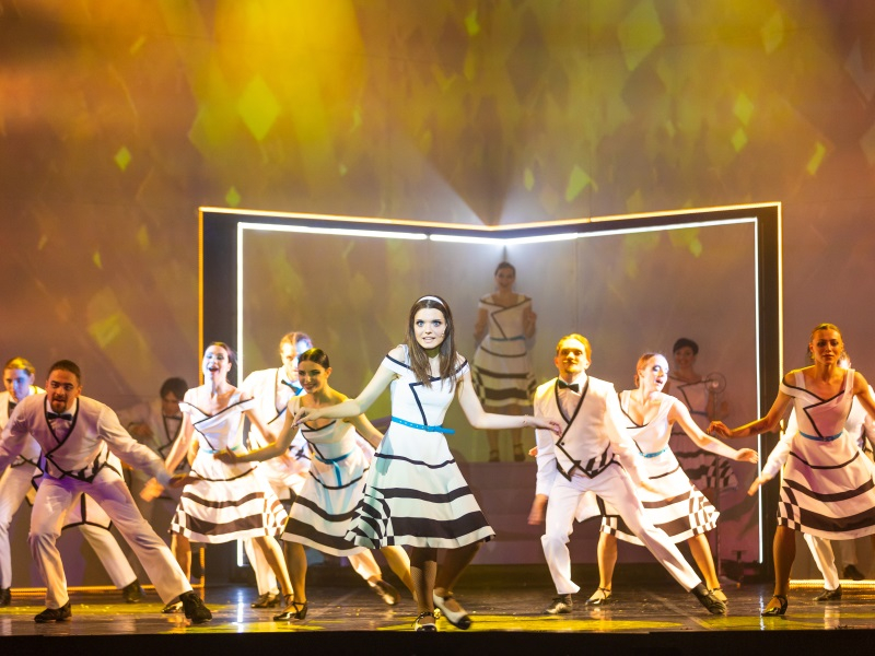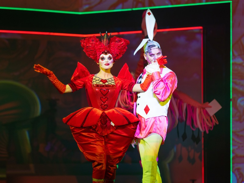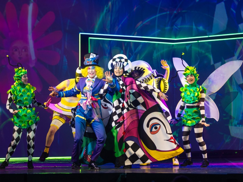 Какая она, Страна чудес, в мюзикле? Первое, что приходит на ум – яркая. Яркая во всем: в героях, костюмах, песнях, танцах, декорациях. Говоря о последнем, стоит отметить, что как таковых декораций на сцене немного: обрамляют ее карты разной масти и достоинства, а во время самого действия на ней в разное время появляются карета и трон Королевы да полянка с грибами. Львиную долю по созданию картинки взял на себя мультимедийный экран, который на протяжении всего спектакля переносит зрителя в разные локации: будь то шумный мегаполис, в котором живет Алиса, или опушка леса, на которой Алиса встречает Шляпника. Помимо этого, транслируемый видеоряд отражает черно-белую картину Страны чудес, например, шахматная доска и всплывающие периодически фрагменты текста. Кстати, знаменитый и любимый многими Чеширский кот также появляется перед зрителями в виде проекции на экране.