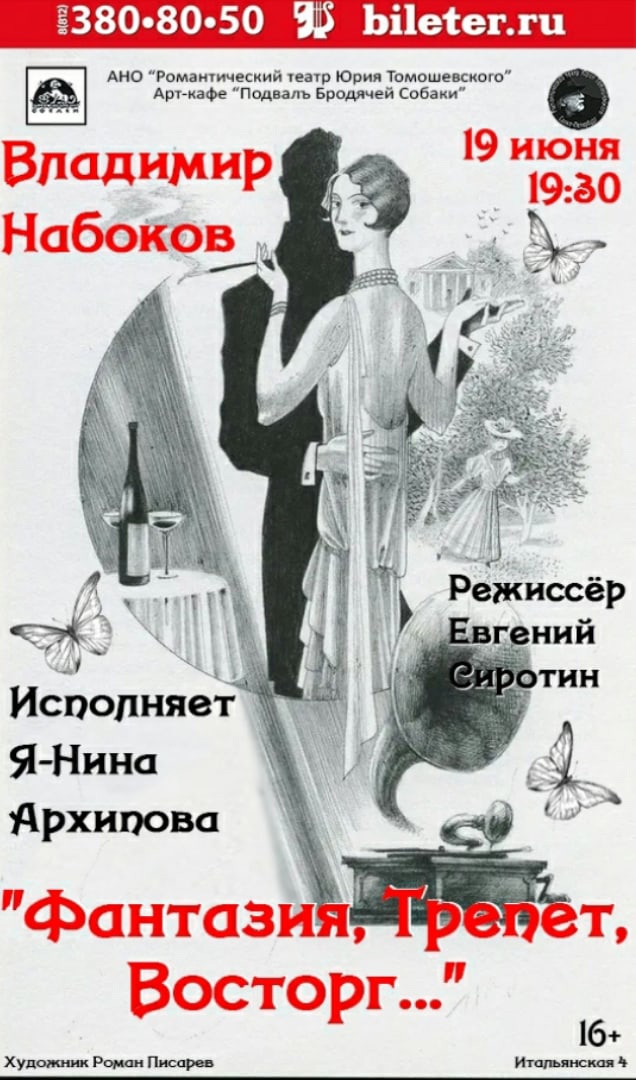 Премьера моноспектакля по рассказам и стихам Владимира Набокова «Фантазия, трепет, восторг…» состоится 19 июня в 19.30 в Арт-Подвале Бродячей Собаки. Исполняет Я-Нина Архипова. Режиссёр — Евгений Сиротин.