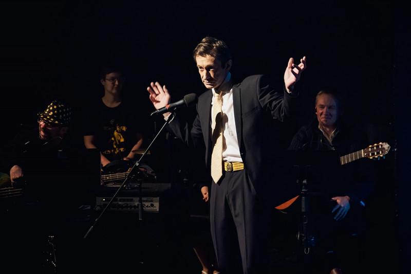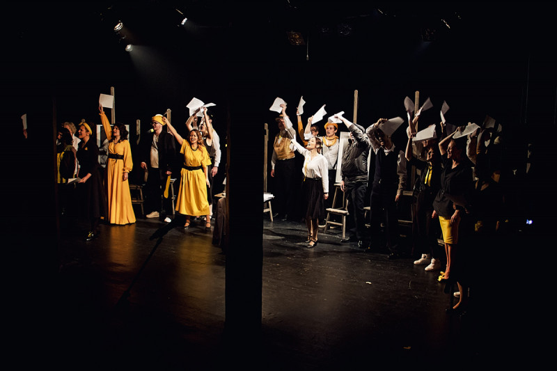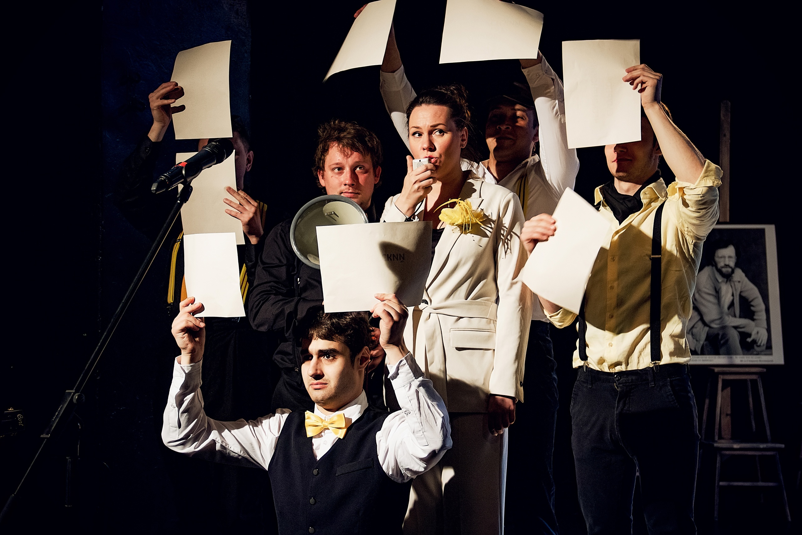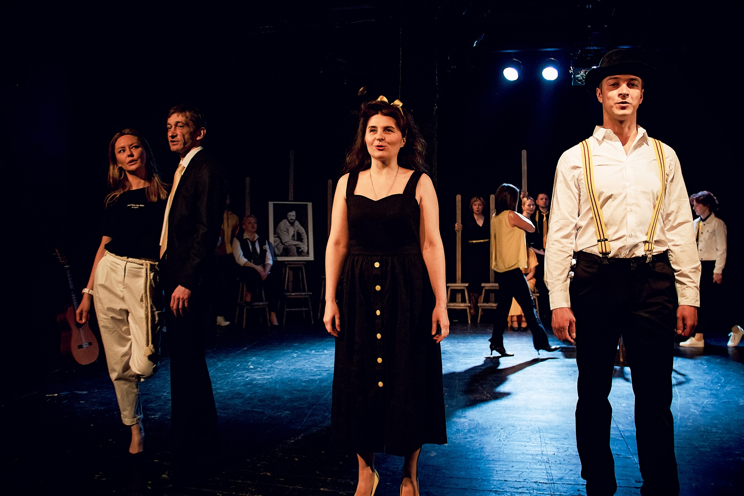Идеалом Юрия Александровича была «маленькая комната, в которой много людей, и вдруг кто-то запел песню». Весь спектакль – это, по сути, концерт, и в нем звучат шлягеры и романсы: «В парке Чаир», «Наш сосед», «Васильевский остров» и другие. На экране и мольбертах – фотографии. Актеры перевоплощаются в автора дневника и всех, тех, о ком он пишет. Так, например, Григорий Сергеенко становится то напыщенным парторгом, то злобным заключенным, то приятелем – собутыльником, Владимир Шабельников танцует и дирижирует. И между короткими сценами из жизни режиссера, в которых заняты Марина Конюшко, Анна Васильева, Григорий Татаренко, Иван Байкалов, Артем Лисач и многие другие, все постоянно поют. А больше всех нежным, высоким, мелодичным, как колокольчик, голосом поет Виола Лобань, ей аккомпанирует «оркестрик»: Виктор Кренделев, Сергей Линьков и Мария Коносова.