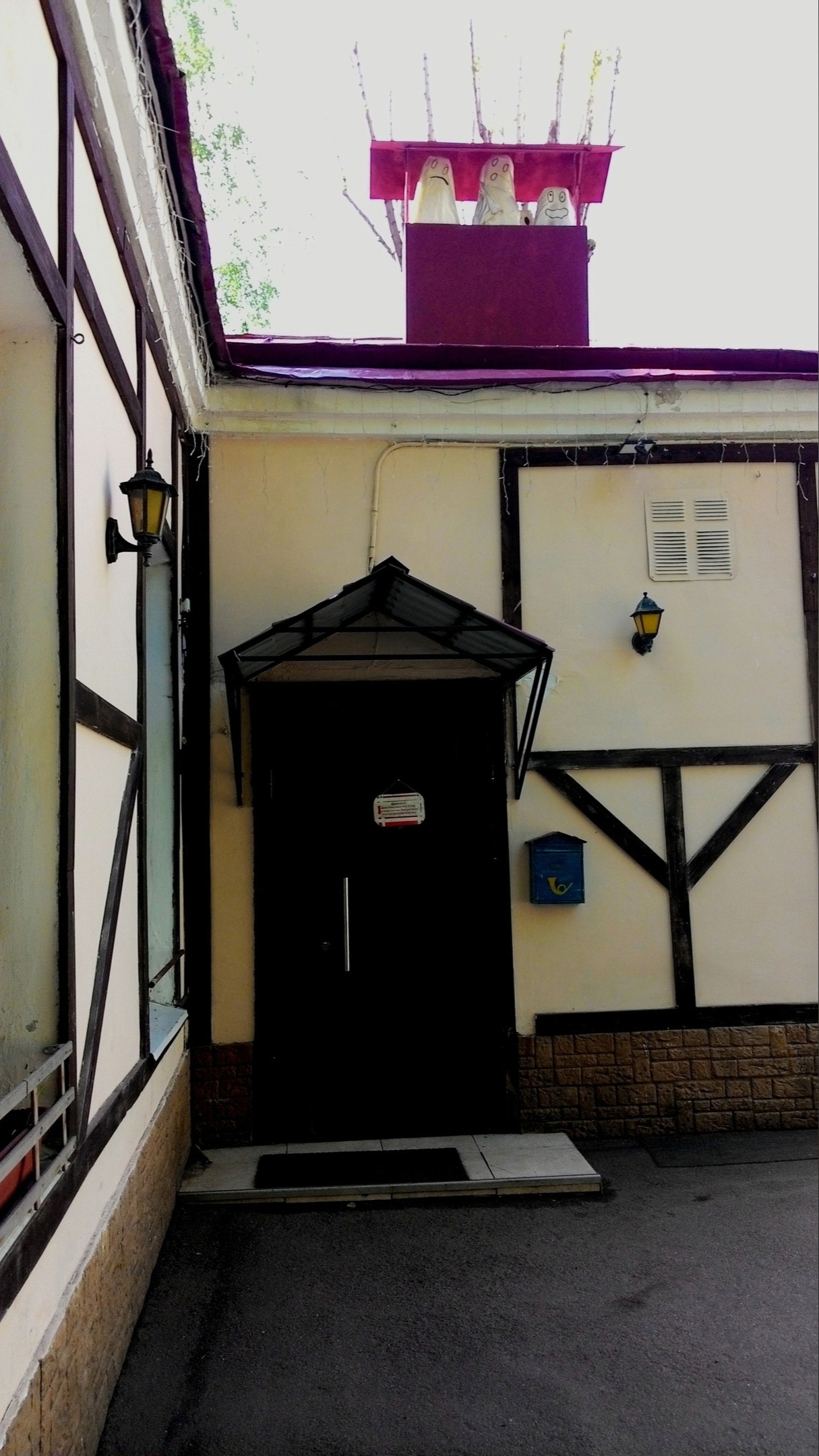 Перед Домиком установлен специальный стенд, в котором хранятся запасные пропеллеры Карлсона. Дети их крутят с большим удовольствием. А на крыше сидит целая компания привидений. Кто из них Карлсон?
